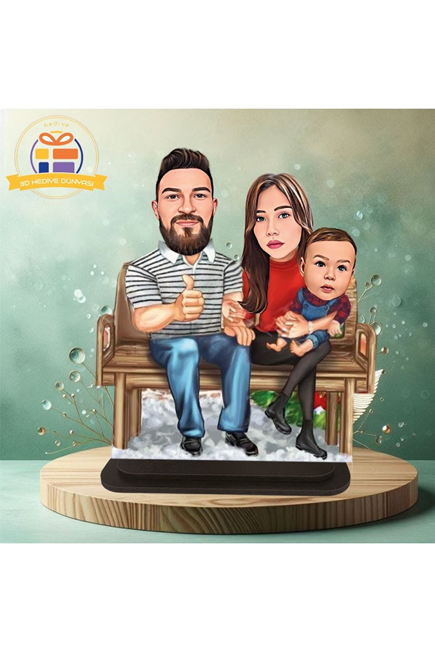 Bankda oturan aile karikatürlü biblo hediye 3d masa üstü biblo hediyesi