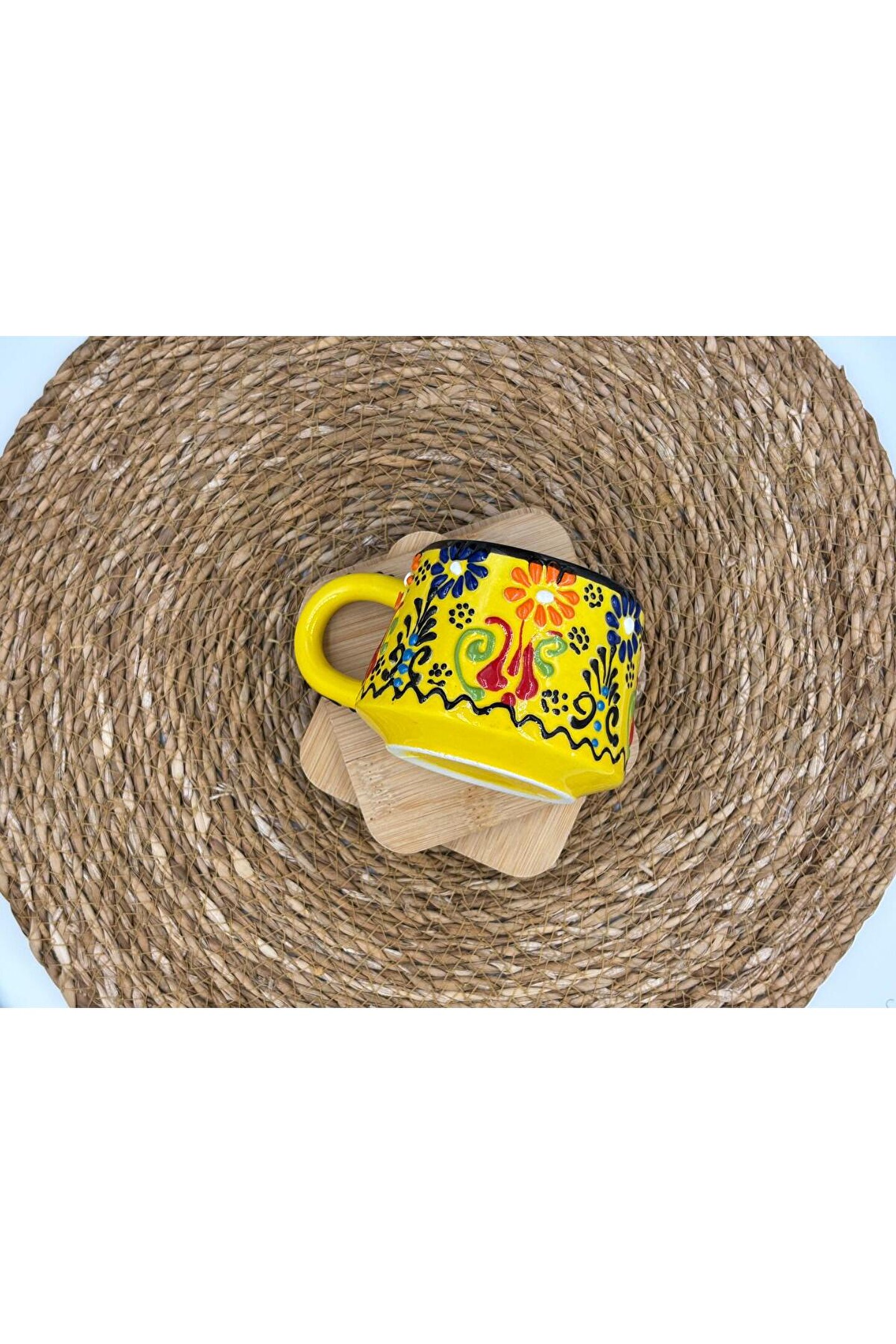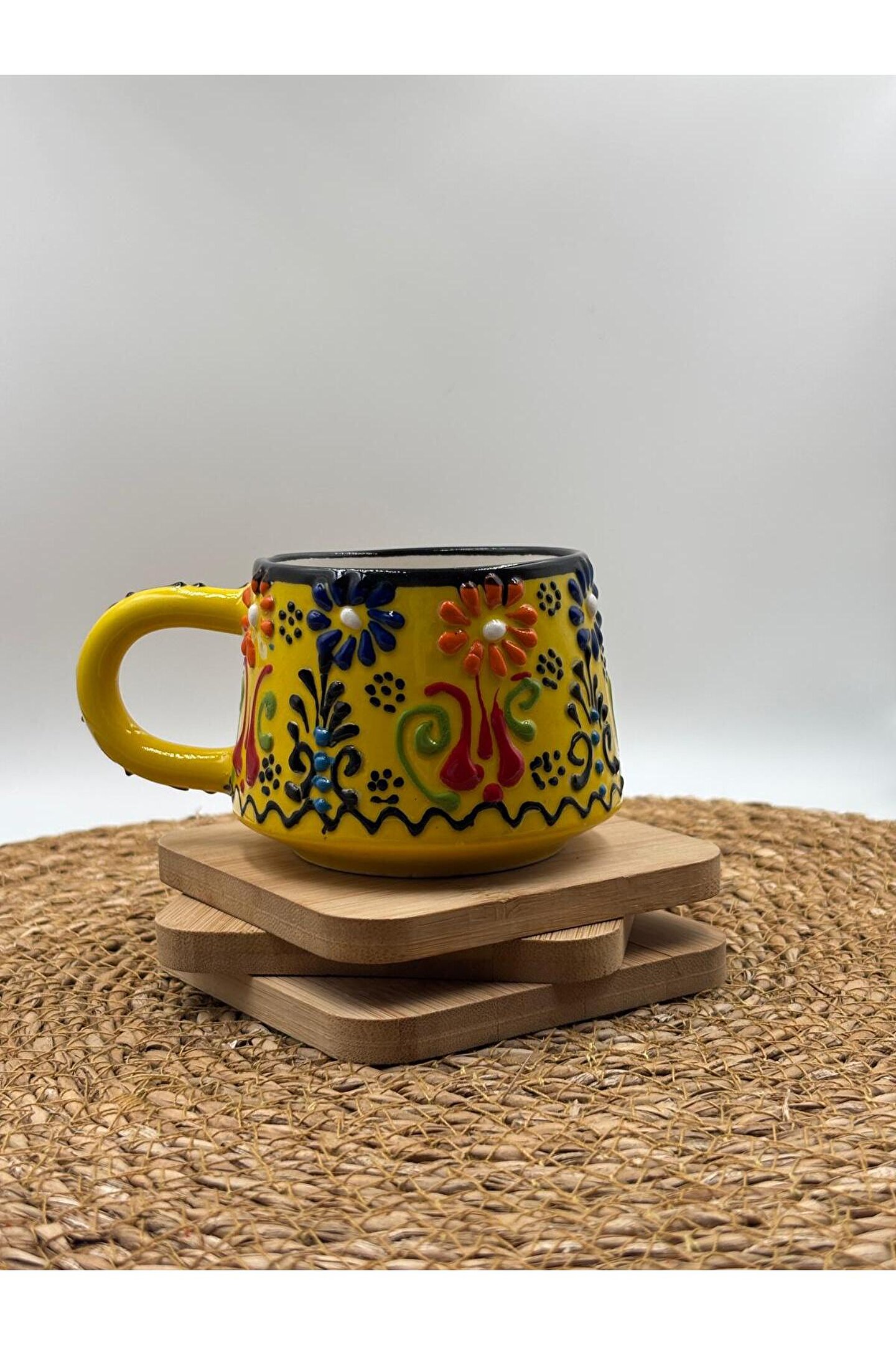 - El yapımı seramik malzemesiyle üretilmiş, benzersiz ve otantik bir tasarıma sahip.; - Kabartma desenleri ile zenginleştirilmiş yüzeyi, görsel olarak çekici bir görünüm sunar.; - 250 ml kapasitesi sayesinde içeceklerinizi keyifle tüketebilirsiniz.; - Menşei Türkiye'den gelen bu kupa, yerel el sanatlarının özgün bir temsilcisidir.