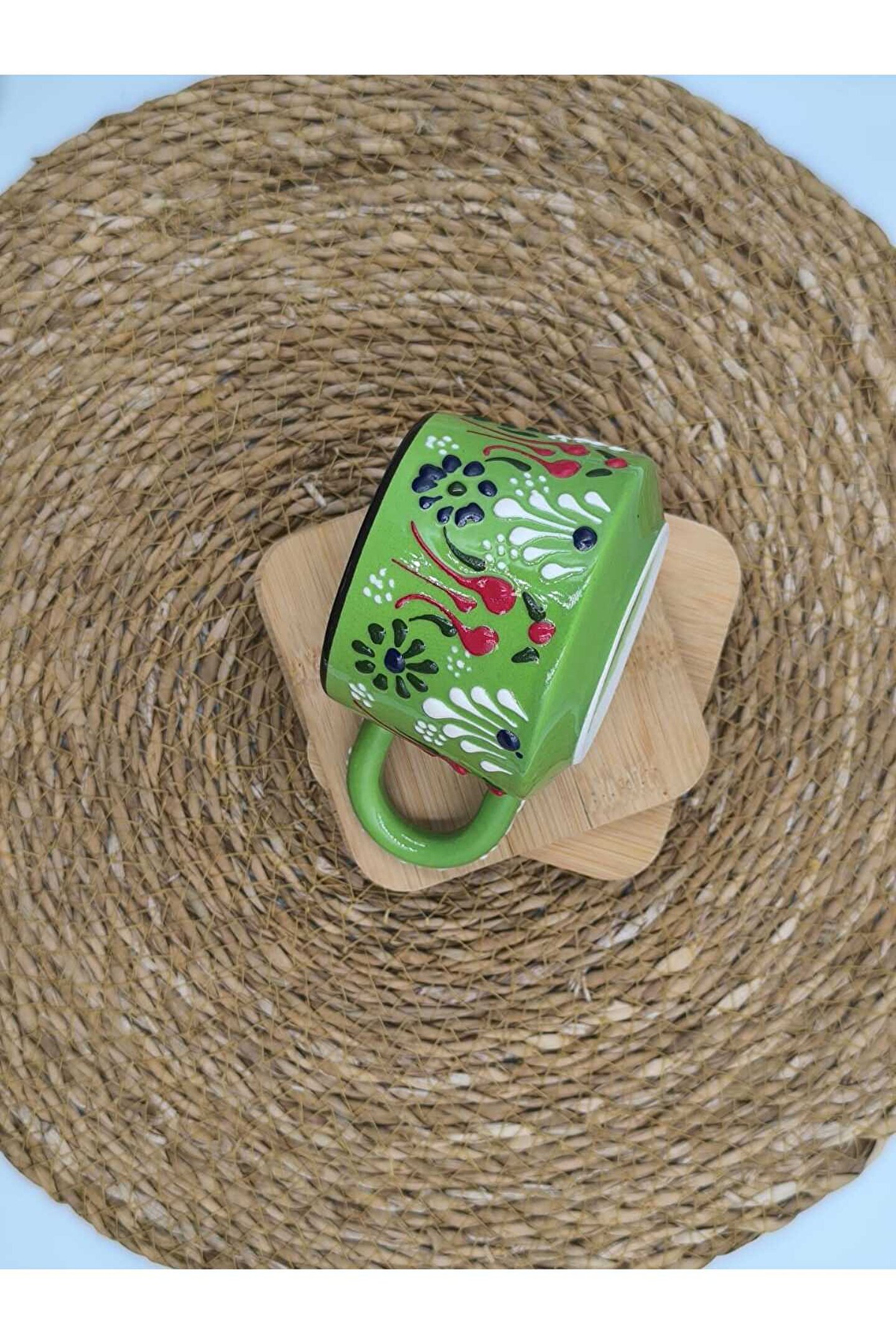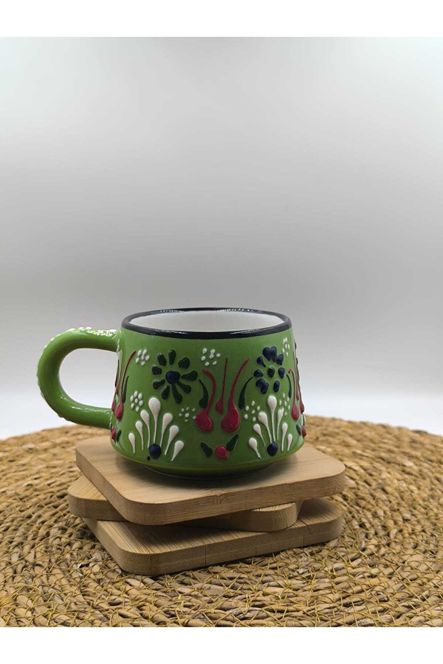 - El yapımı seramik malzemesiyle üretilmiş, benzersiz ve otantik bir tasarıma sahip.; - Kabartma desenleri ile zenginleştirilmiş yüzeyi, görsel olarak çekici bir görünüm sunar.; - 250 ml kapasitesi sayesinde içeceklerinizi keyifle tüketebilirsiniz.; - Menşei Türkiye'den gelen bu kupa, yerel el sanatlarının özgün bir temsilcisidir.