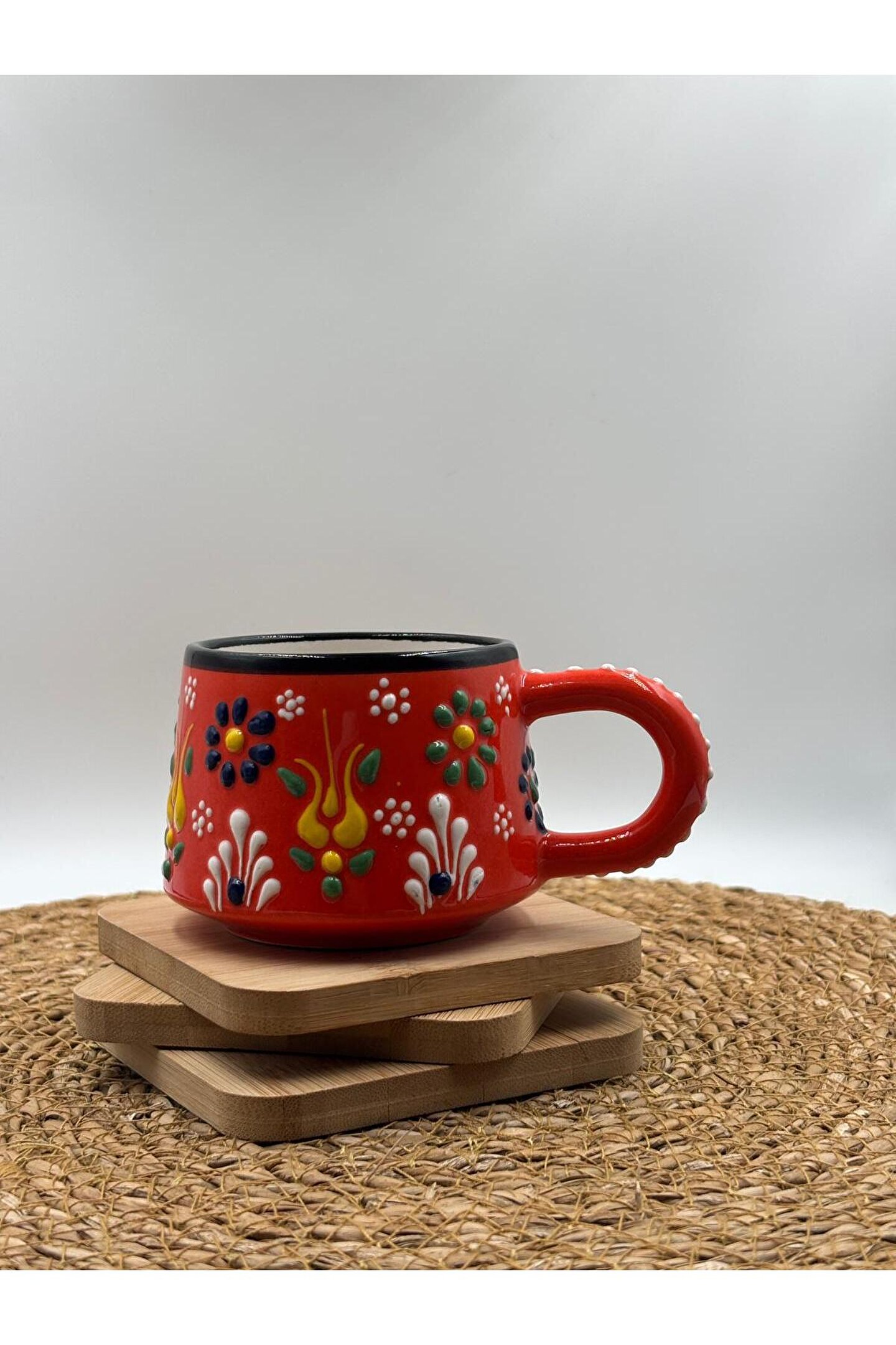 - El yapımı seramik malzemesiyle üretilmiş, benzersiz ve otantik bir tasarıma sahip.; - Kabartma desenleri ile zenginleştirilmiş yüzeyi, görsel olarak çekici bir görünüm sunar.; - 250 ml kapasitesi sayesinde içeceklerinizi keyifle tüketebilirsiniz.; - Menşei Türkiye'den gelen bu kupa, yerel el sanatlarının özgün bir temsilcisidir.