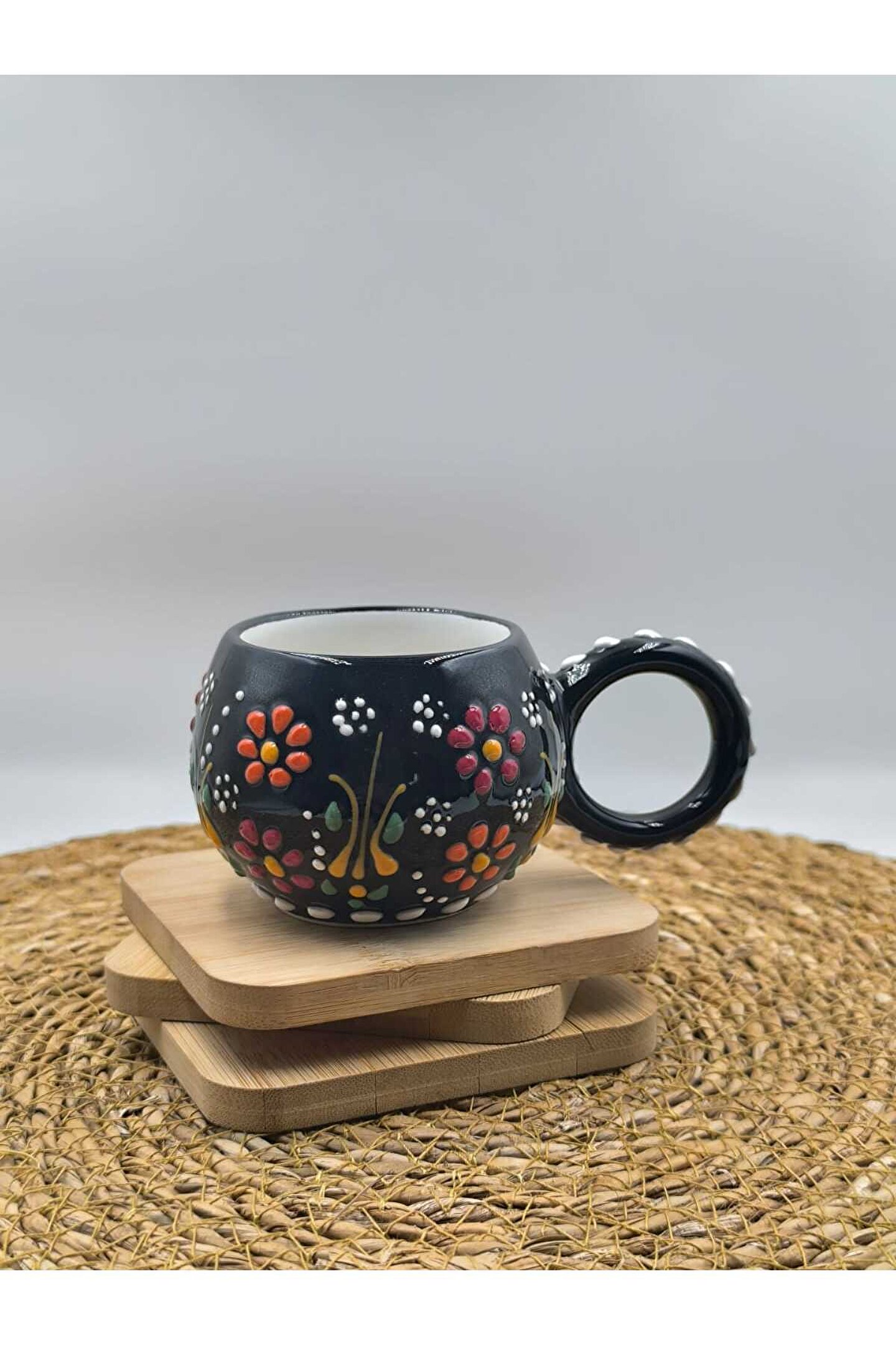 - El yapımı seramik malzemesiyle üretilmiş, benzersiz ve otantik bir tasarıma sahip.; - Kabartma desenleri ile zenginleştirilmiş yüzeyi, görsel olarak çekici bir görünüm sunar.; - 250 ml kapasitesi sayesinde içeceklerinizi keyifle tüketebilirsiniz.; - Menşei Türkiye'den gelen bu kupa, yerel el sanatlarının özgün bir temsilcisidir.