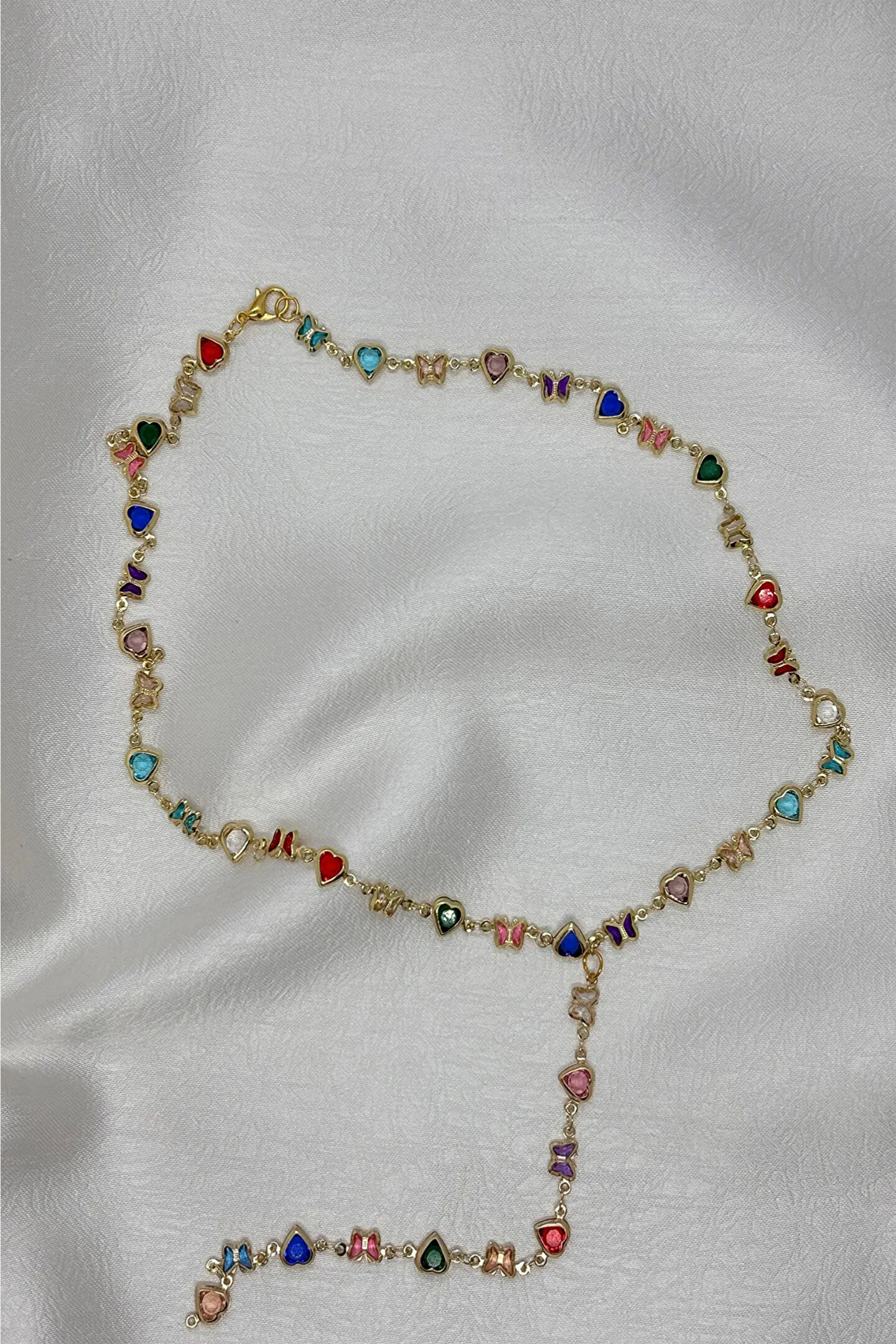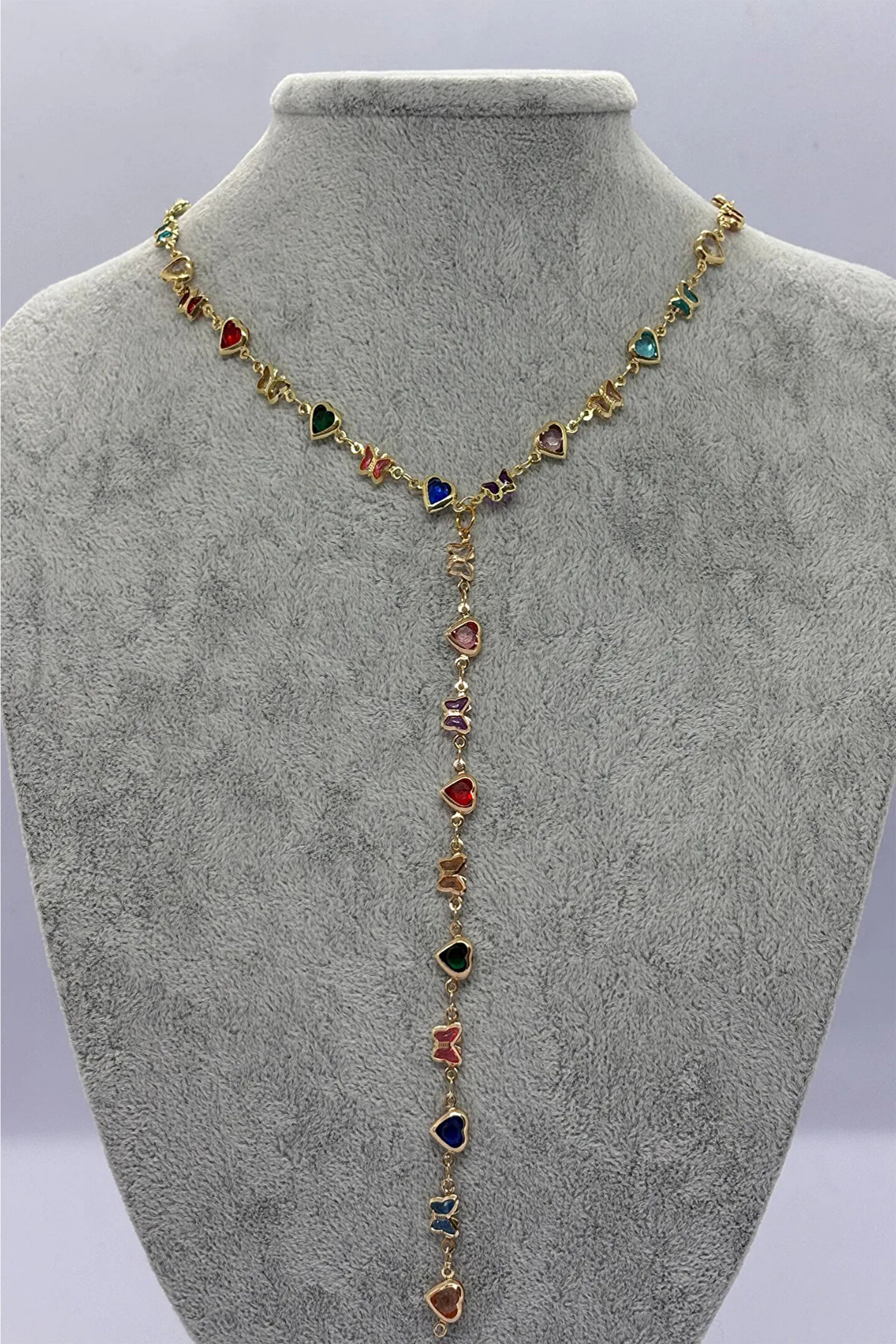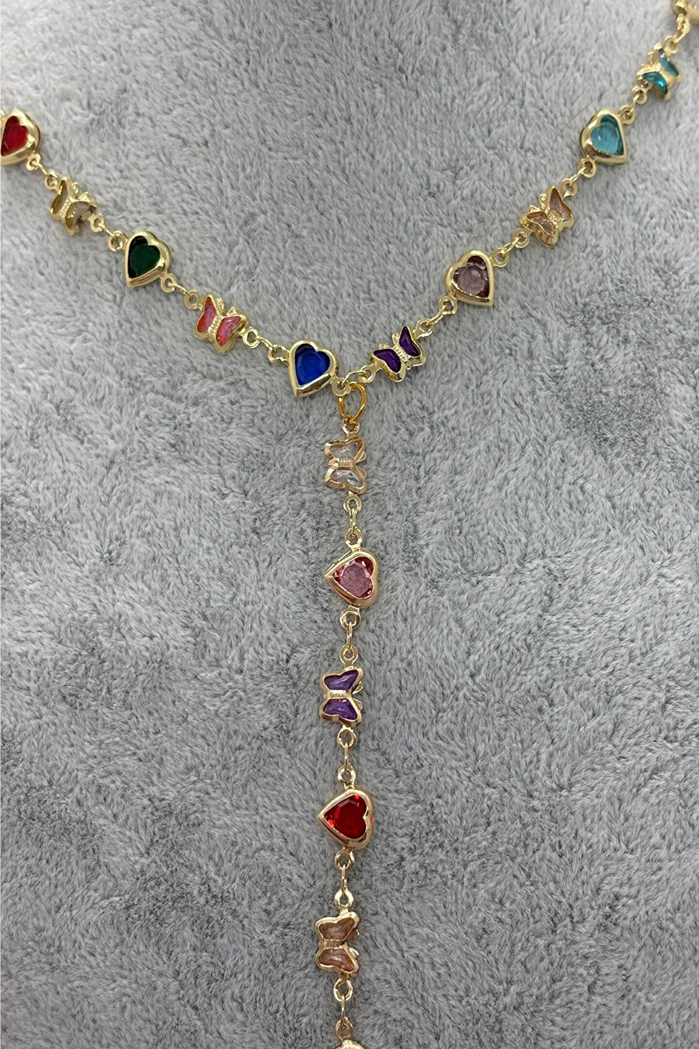 - Zarif tasarımıyla dikkat çeken bu altın renkli kolye, her türlü özel gününüzde şıklığınızı tamamlar.; - Kalp ve kelebek motifleriyle süslenmiş olan bu kolye, romantik anlarınıza anlam katmak için idealdir.; - Altın rengi sayesinde parlaklık ve zarafet sunan bu kolye, günlük kullanım için de uygundur.; - Her yaştan kadının beğenisine hitap eden bu model, takı koleksiyonunuzda vazgeçilmez bir parça haline gelir.