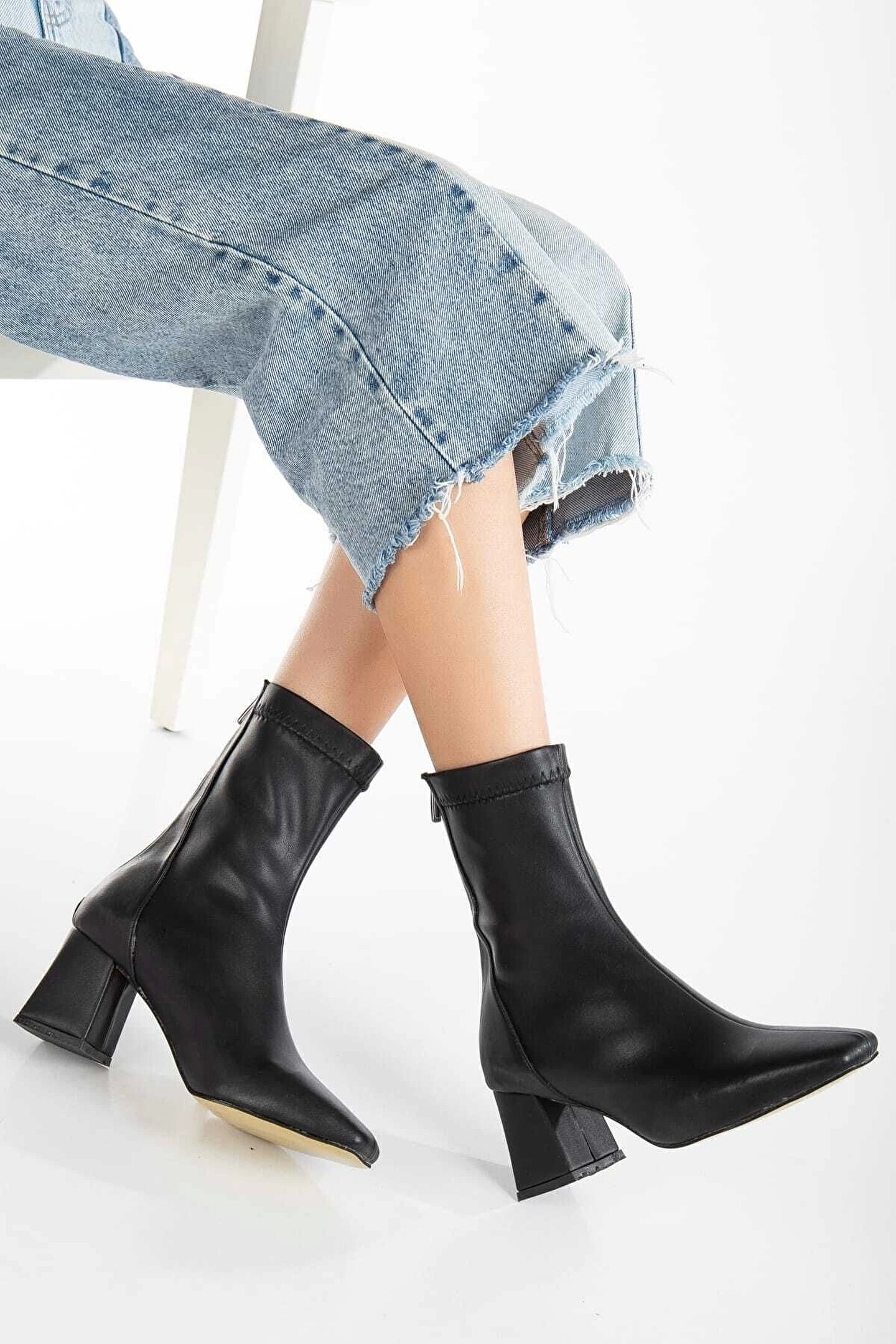 Kadın Siyah Deri Küt Burun Orta Boy Topuklu Bot