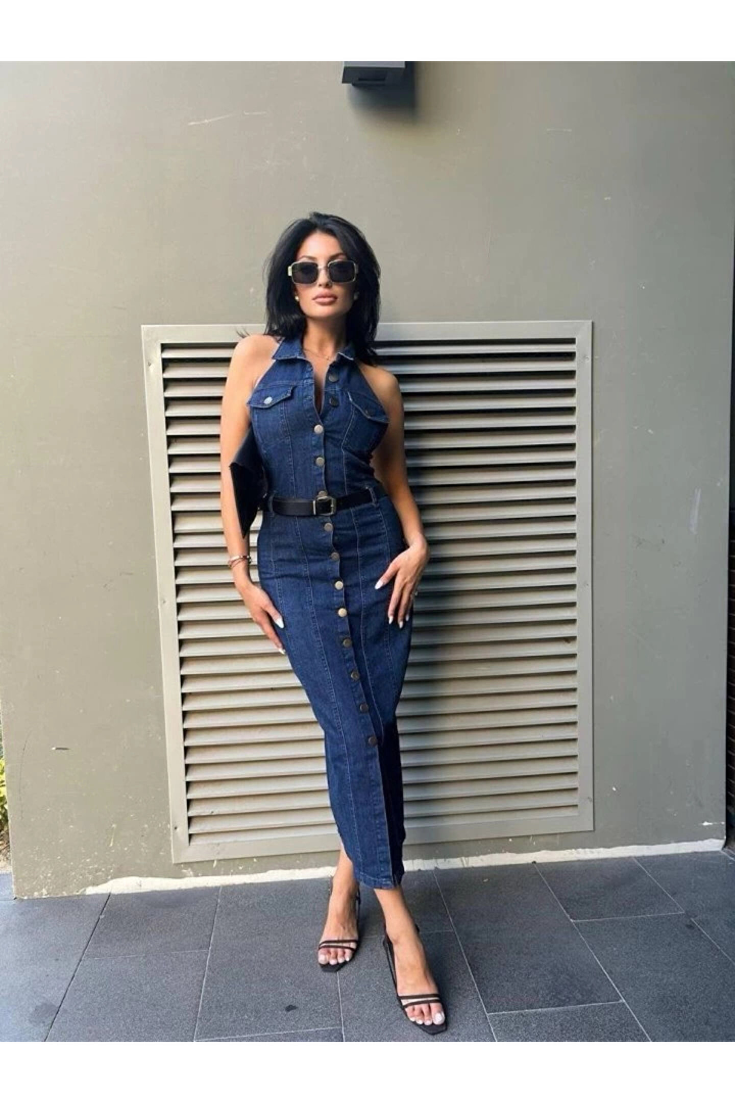 Adora Moda Kadın Düğme Detaylı Belden Kemerli Sırt Dekolte Kot Elbise
