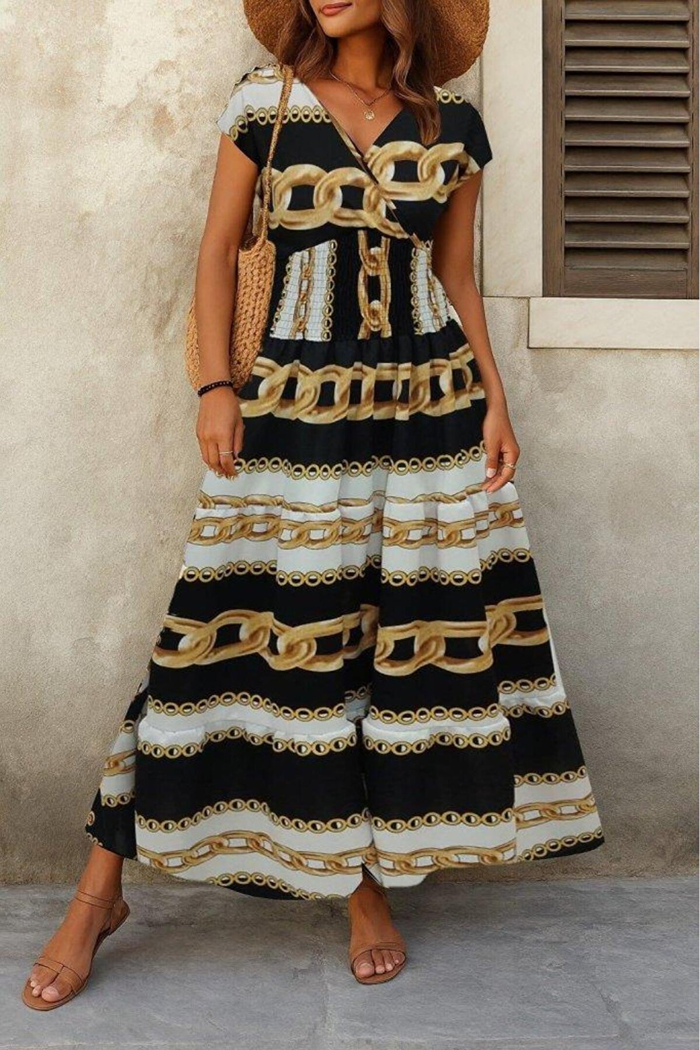 Adora Moda Kadın Kısa Kollu Kruvaze Yaka Beli Lastikli Süprem Maksi Boy Elbise