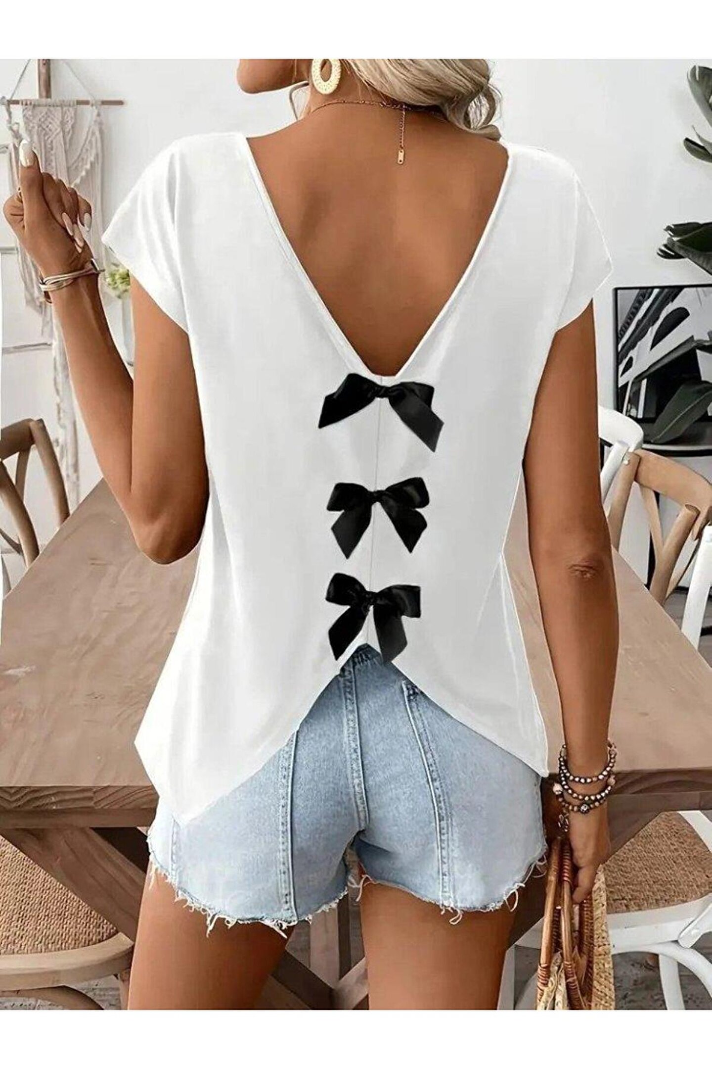 Kadın Kısa Kollu V Yakalı Arkadan Kurdele Detaylı Viskon Bluz