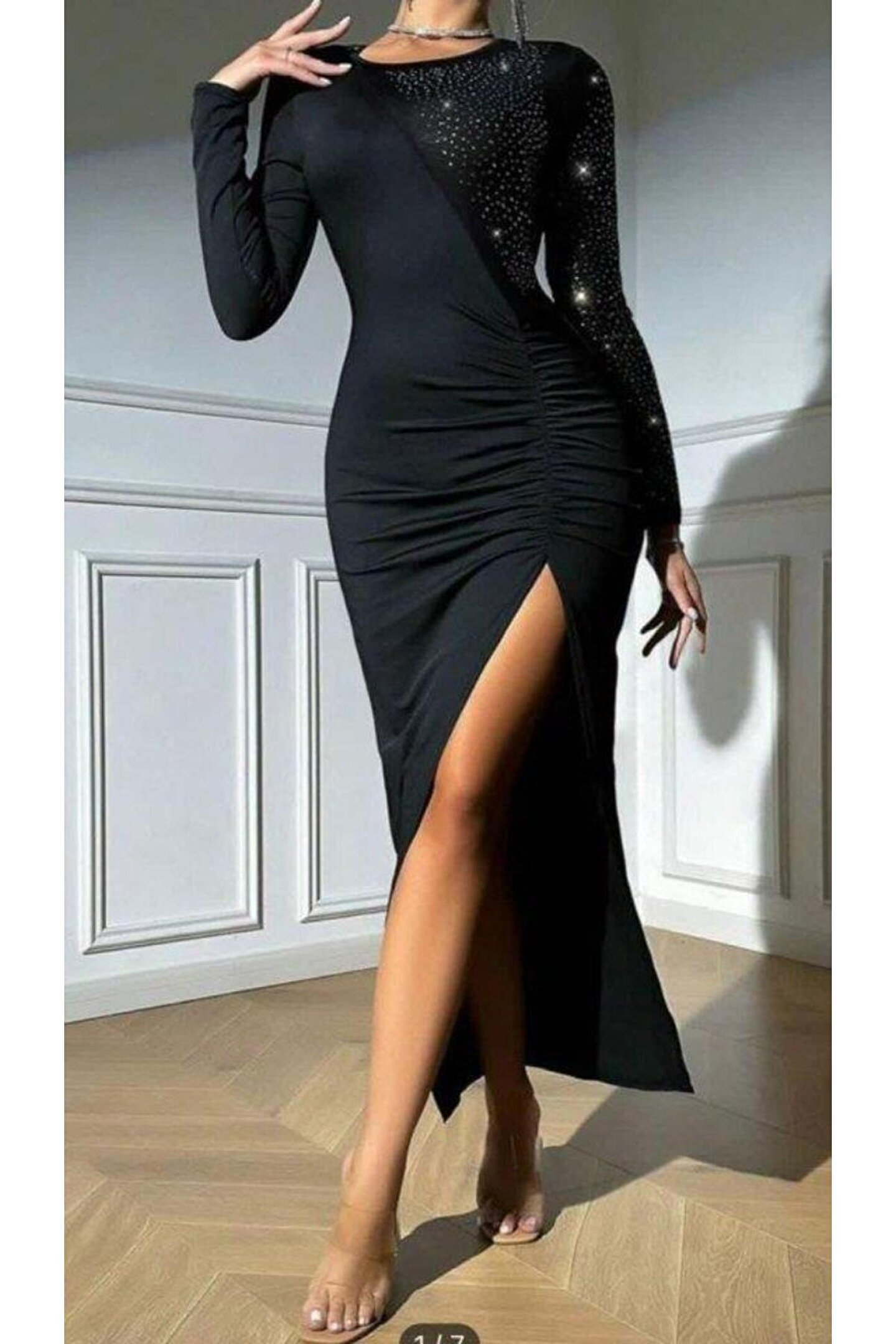 Kadın Krep Dalgıç Kumaş Taş Aksesuarlı Yırtmaç Detaylı Uzun Kollu Elbise