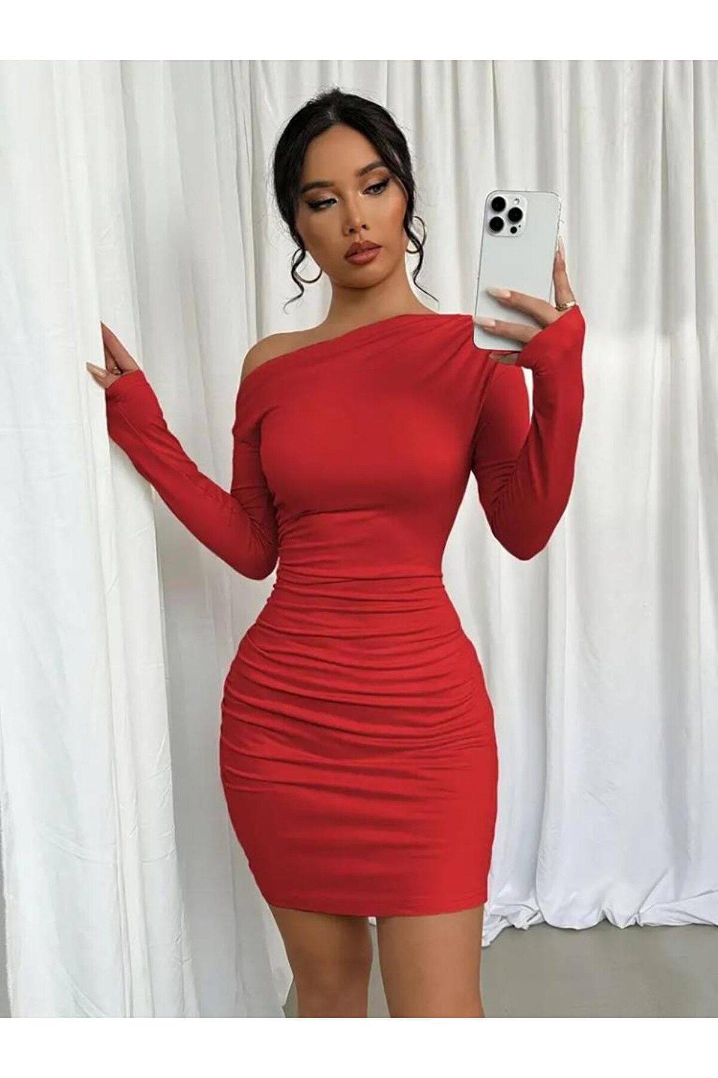Kadın Uzun Kollu Tek Omuzu Açık Yanlardan Büzgülü Kısa Sandy Elbise