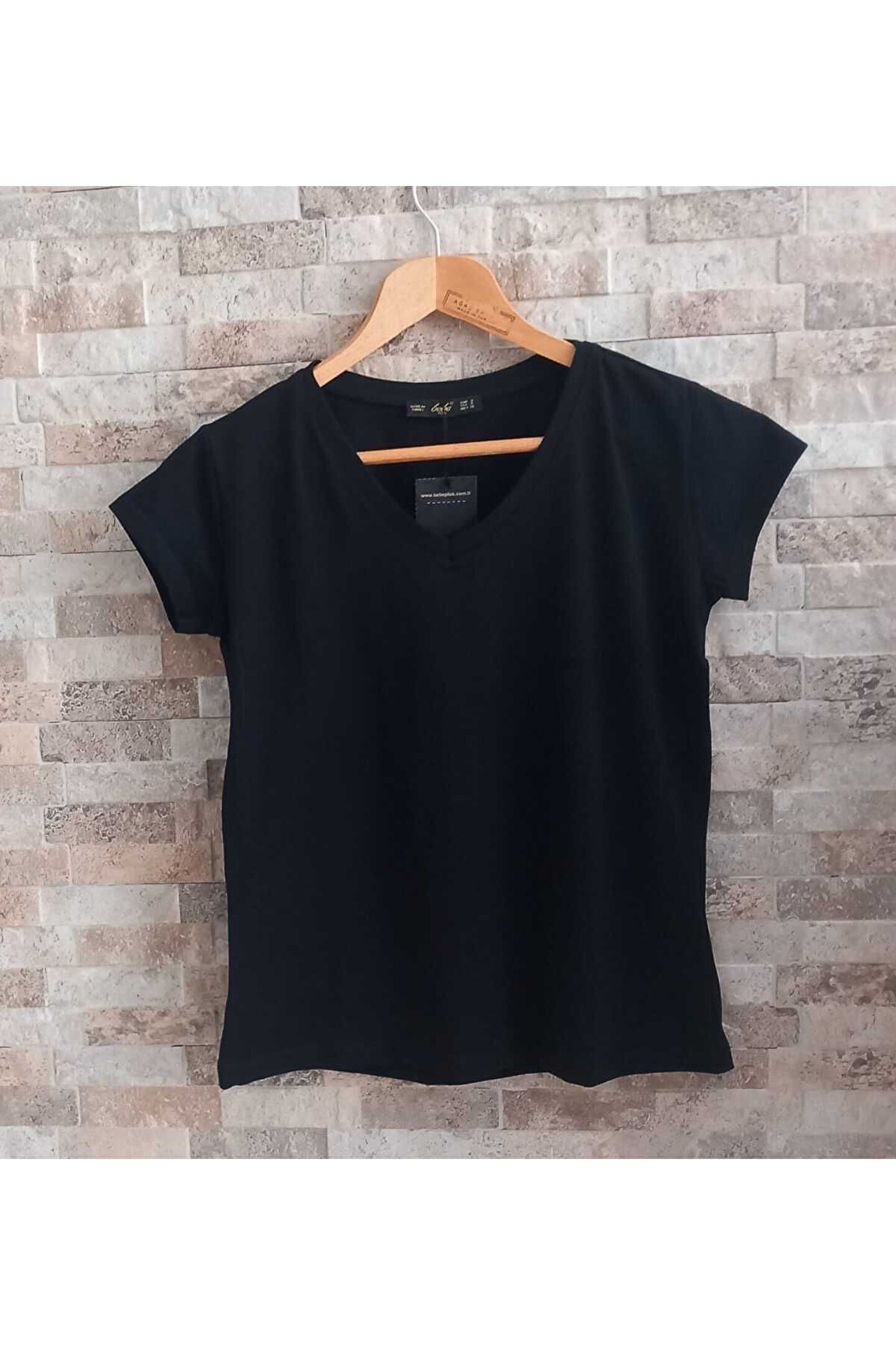 Süper kalite siyah V-yaka kadın pamuk penye T-Shirt