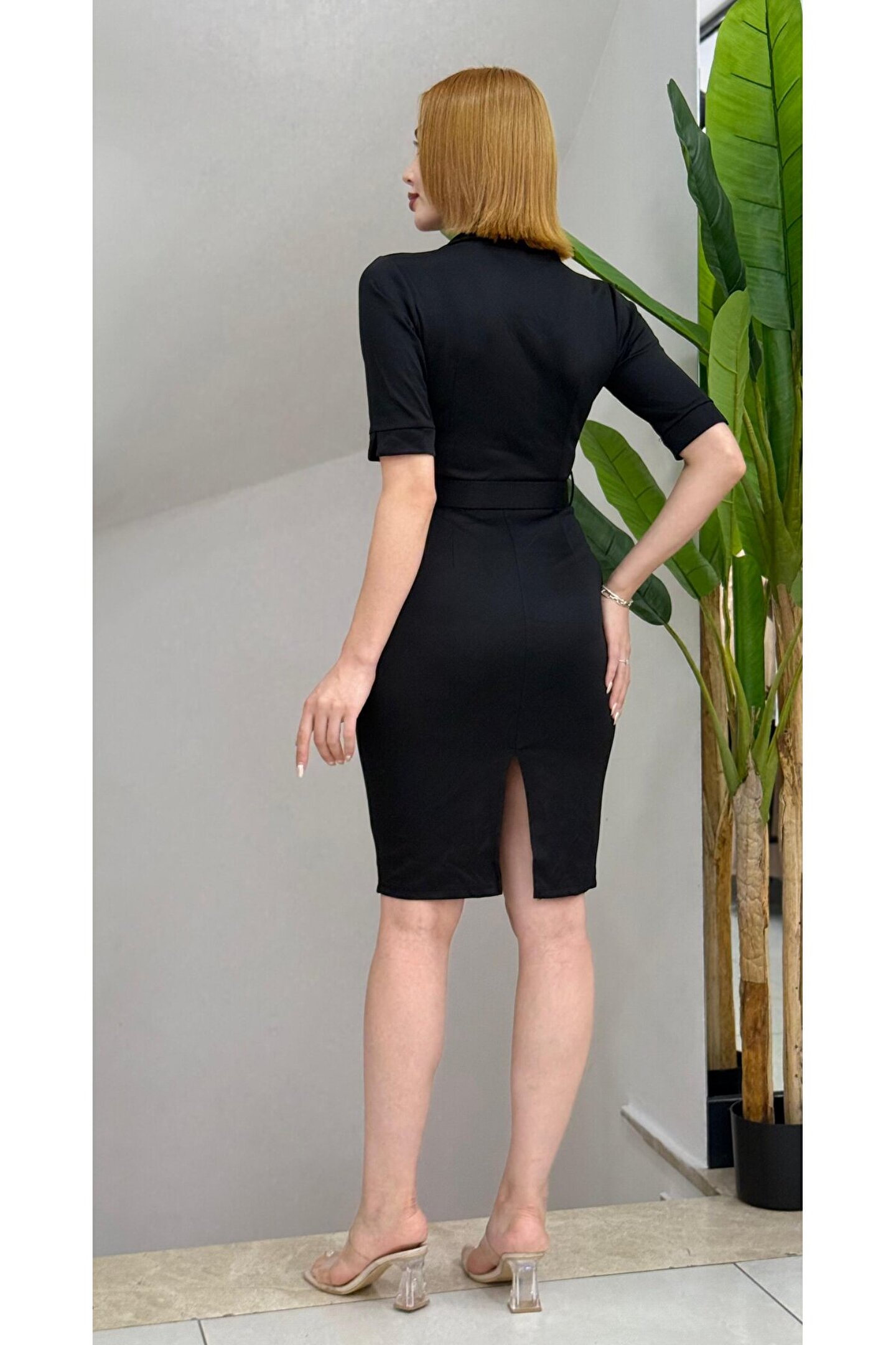 Kadın Kısa Kollu Yakalı Kruvaze Yakalı Beli Kemerli Midi Modal Elbise