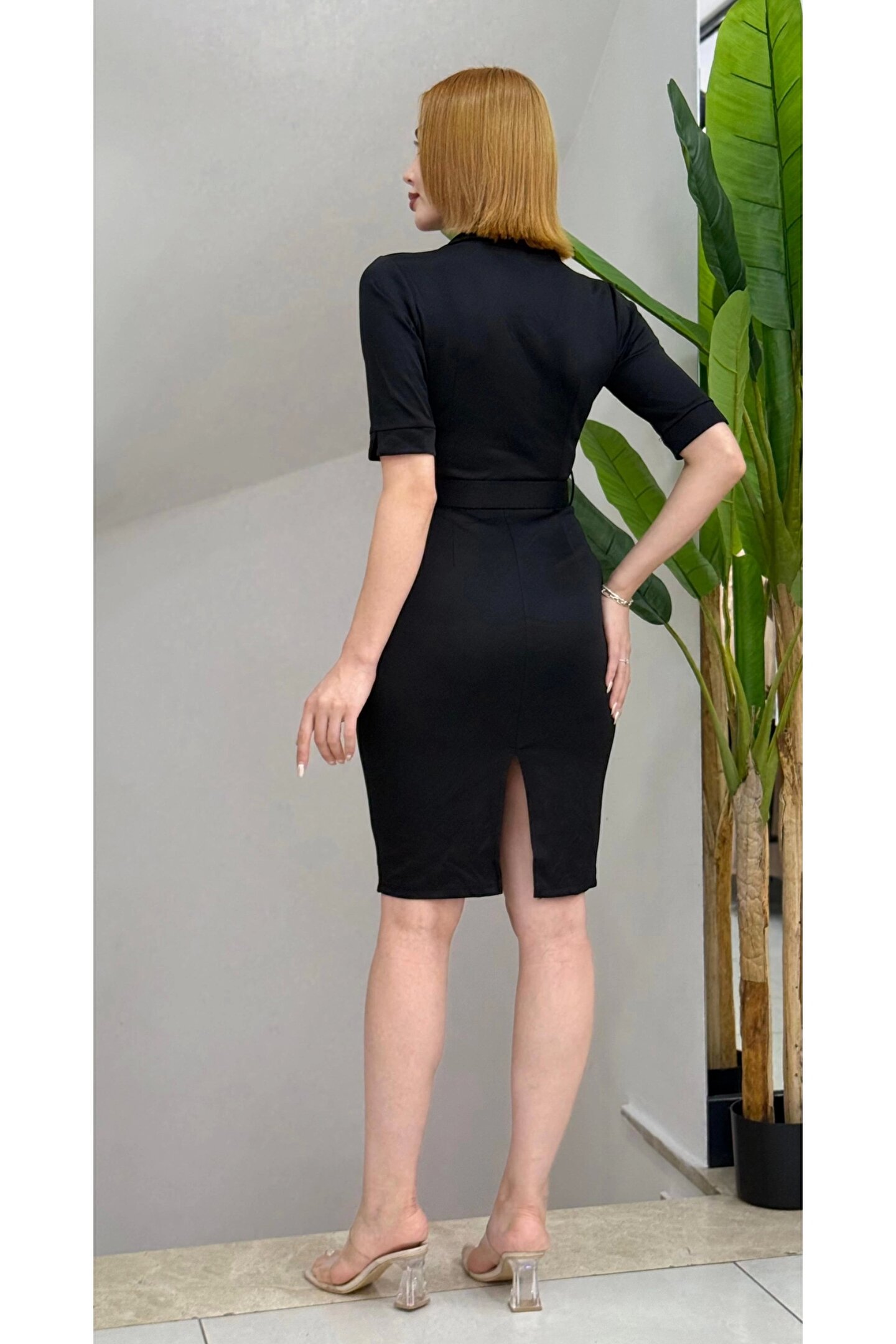 Aesco Kadın Kısa Kollu Yakalı Kruvaze Yakalı Beli Kemerli Midi Modal Elbise