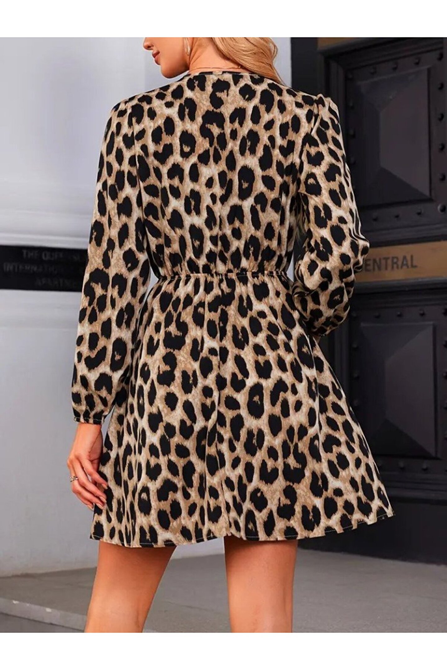 Aesco MODAVERA Kadın Uzun Kollu Kruvaze Yaka Kemerli Desenli Mini Leopar Elbise