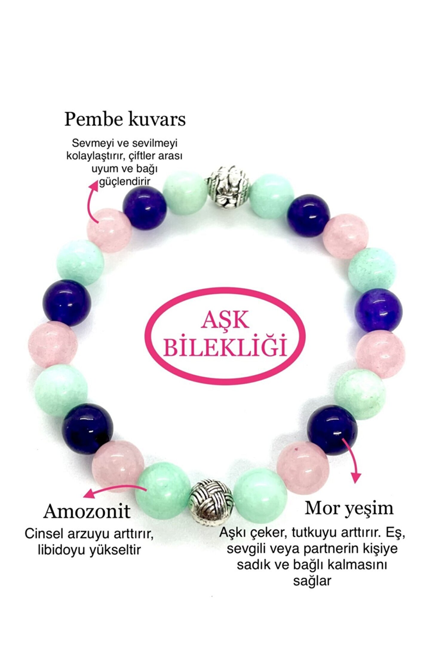 Doğal Taş Aşk, Sevgi ve Çiftler Arası Unisex Bilekliği Enerji Akışına Uygun Şekilde Bioenerji Uzmanlarımız Tarafından Özel Olarak Özenle Tasarlanmıştır. Kullanılan Taşlar Hitap Ettiği Çakralardaki Tıkanıkların Açılmasında Etkili Olduğu Ulusal ve Uluslararası Literatürlerce İspatlanmıştır. Doğal Taşların Mistik Enerjisiyle Uyum ve Ahenk İçinde Tasarlanmış Olan Aşk Bilekliğinde Kullanılan Gül Kuvars, Ametist ve Amazonit Doğal Taşlarının Başlıca Özellikleri ; Aşk ve Sevgiyi Güçlendirmede, ; Partnerler (Çiftler, Eşler) Arası Uyum ve Sevgi Bağını Artırmada, ; Kişinin Enerjisini Sevgiye Yönlendirme ve Dönüştürme Gücünü Yükseltmede, ; İç Barışı ve Uyumu Sağlamada, ; Cinsel Arzuyu Arttırmada Etkilidir. ; Güncelleme: Geri Bildirimizleriniz doğrultusunda 29.12.2021 tarihinden itibaren Başarı Tılsım Bilekliği metal aparatsız olarak tamamı Doğal Taş olacak şekilde gönderime başlanmıştır. Dipnot: Doğaltaşlar doğada birebir aynı renk ve kırılımlarda çıkmadığı için taşların kırılımları ve renk tonları farklılık gösterebilir. Doğal taşların etkileri bilimsel olarak ispatlanmış olup etki oranları kişiden kişiye değişebilir. Ürünümüz %100 doğaltaş olup tüm testlerden tam not almıştır ve tüm testlere açık olup güvenle satın alabilirsiniz. Memnuniyetinizi önemsiyoruz, sipariş öncesi veya sonrası ürün sorularınızı satıcıya sor butonundan uzman ekibimize sorabilirsiniz. ;