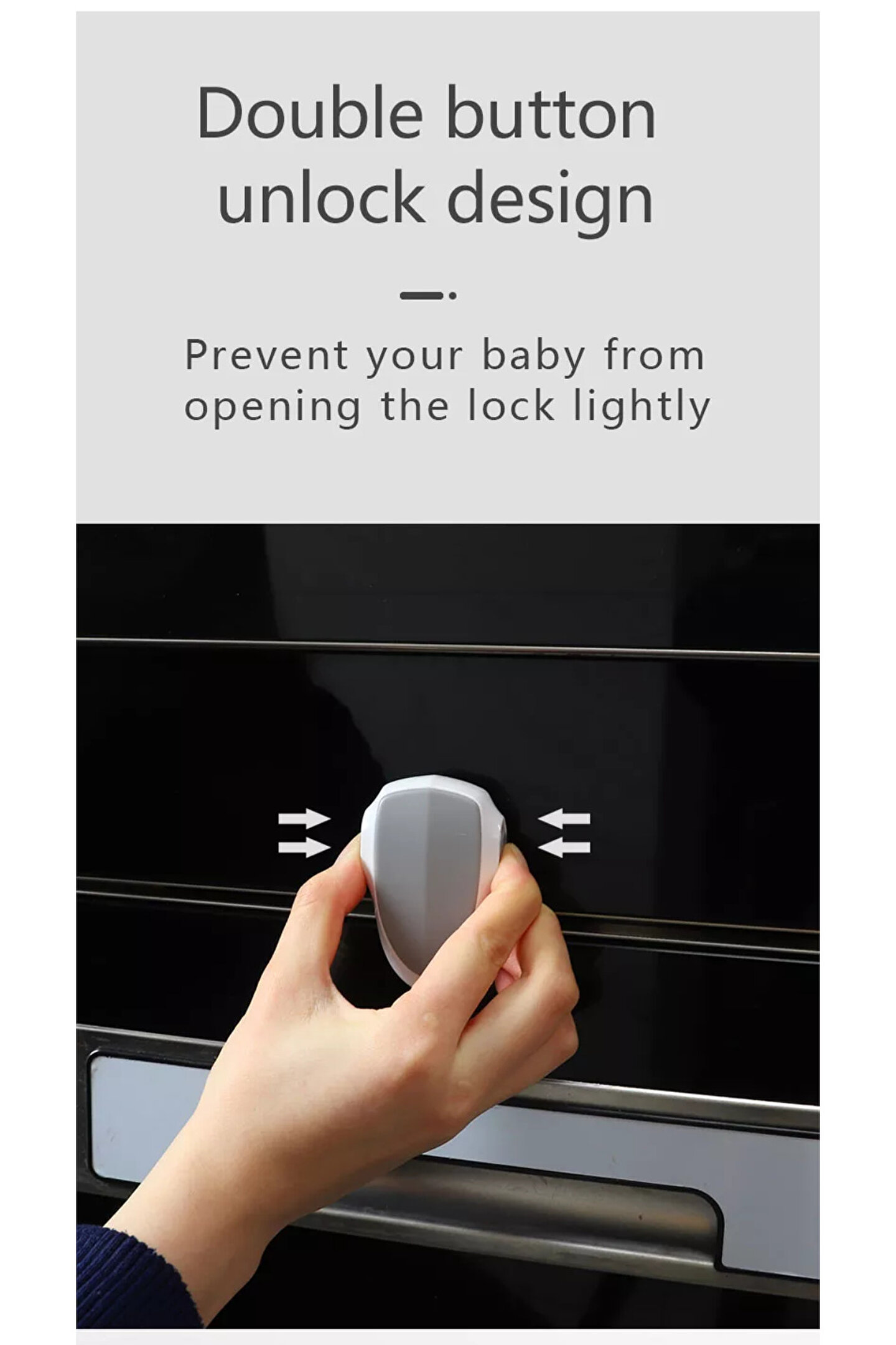 Bebeklerin güvenliği için özel olarak tasarlanmış, dolap kilidi tipi koruyucu kilit, minik ellerin kolayca kullanabileceği çift butonlu kilit mekanizması ile bebeğinizin güvenliğini sağlar; Pratik kullanım sunan bu kilit, bebeğinizin odasının kapısını kolayca kilitleyip açmanızı mümkün kılar ve evdeki diğer odalara erişimini kontrol altında tutar; Bebeklerin güvenliği için ideal olan bu kilidi, dolap kapaklarına kolayca monte edilebilir ve herhangi bir ekstra alet gerektirmez; böylece bebeğinizin odasının güvenliğini hızlı ve kolay bir şekilde sağlayabilirsiniz;