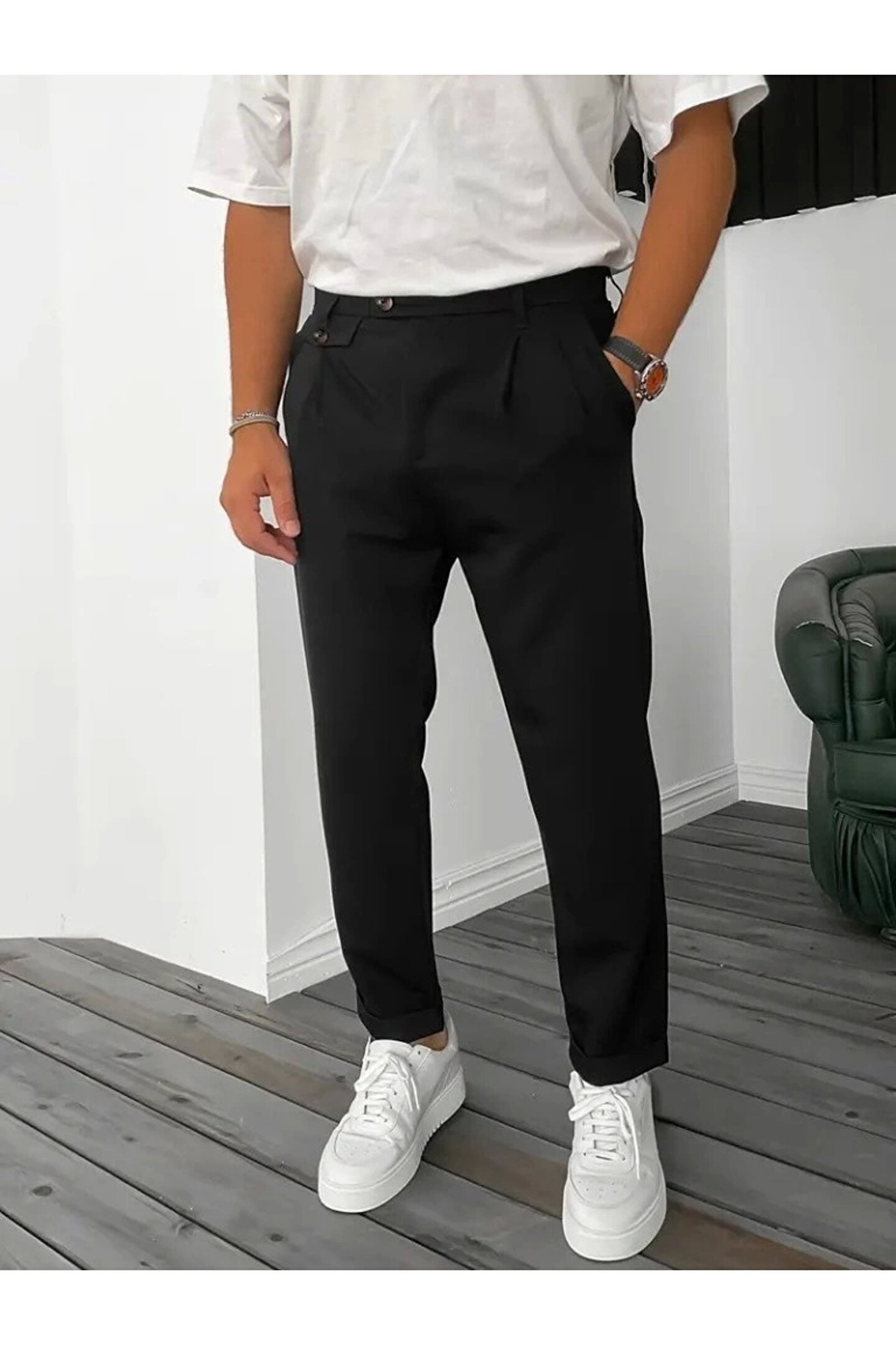 Erkek Belden Düğmeli Cepli Dokuma Pantolon