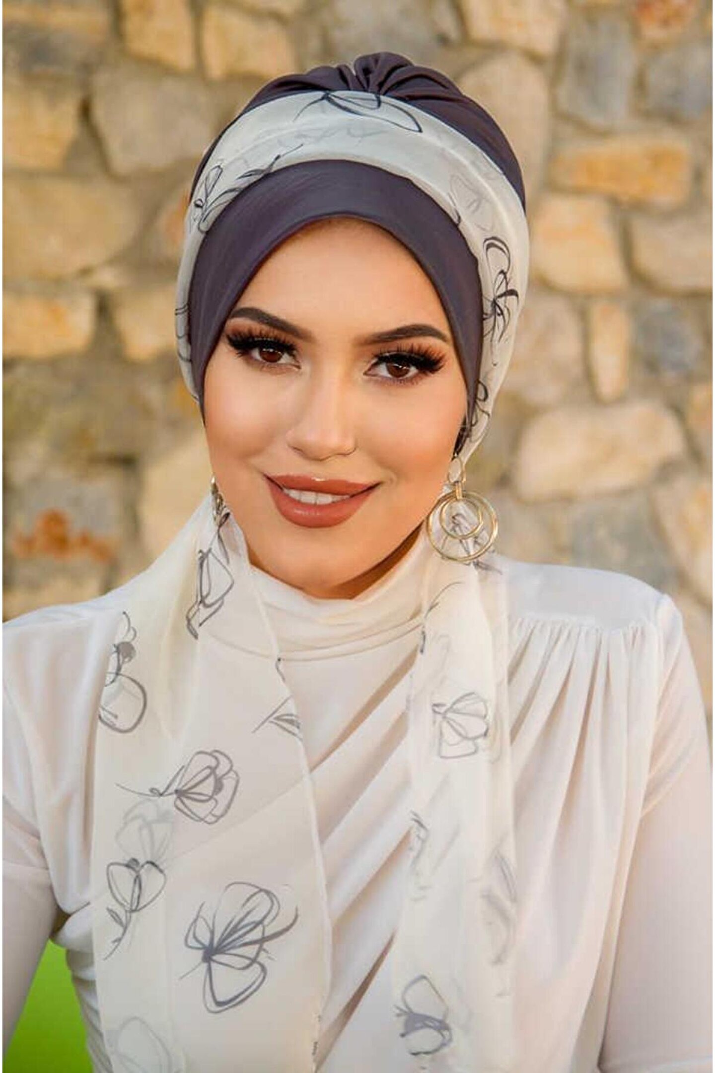 Aişe tesettür Antrasit Beyaz Çiçek Desen Fularlı Bone