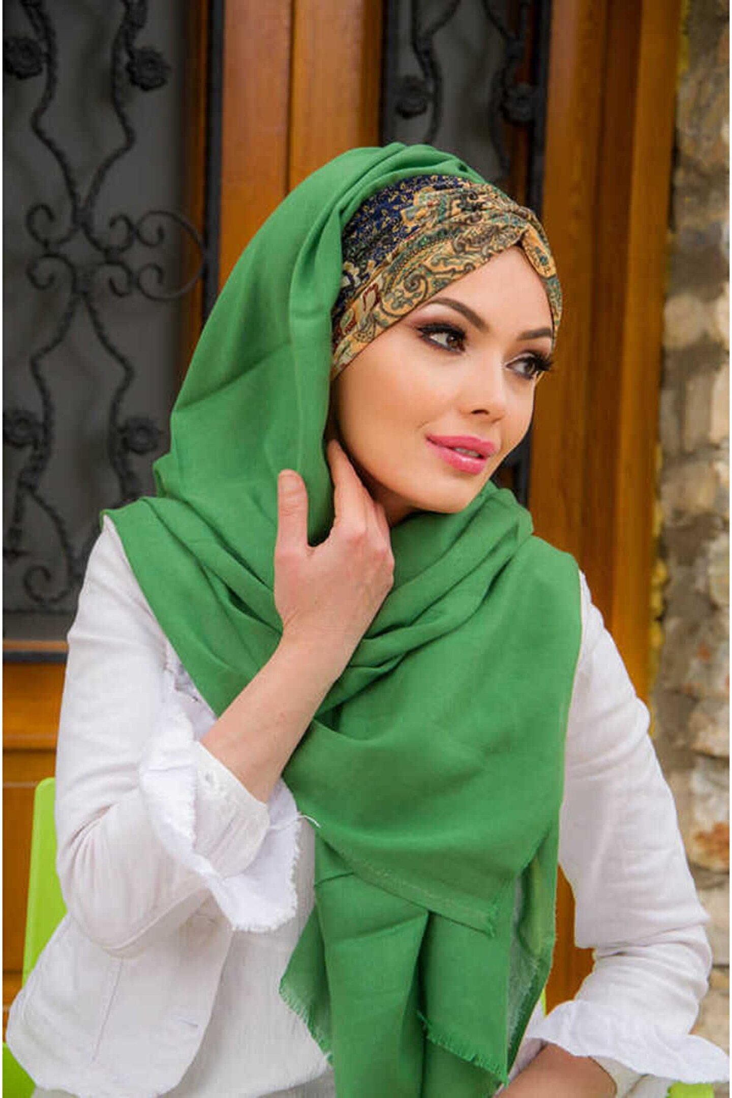 Bahar Yeşili Etnik Desen Büzgülü Hazır Şal