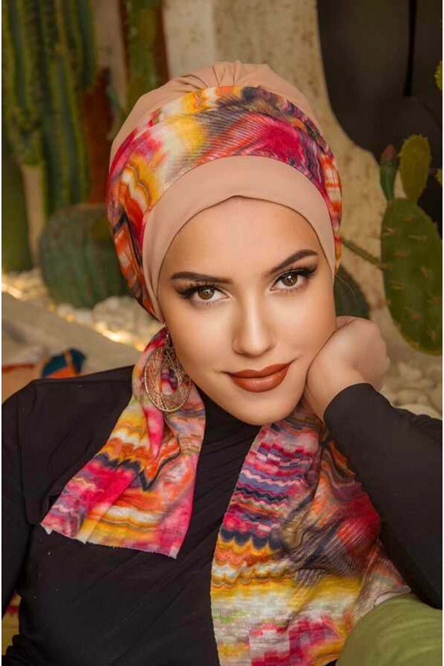 Aişe tesettür Bej Geometrik Desen Fularlı Bone