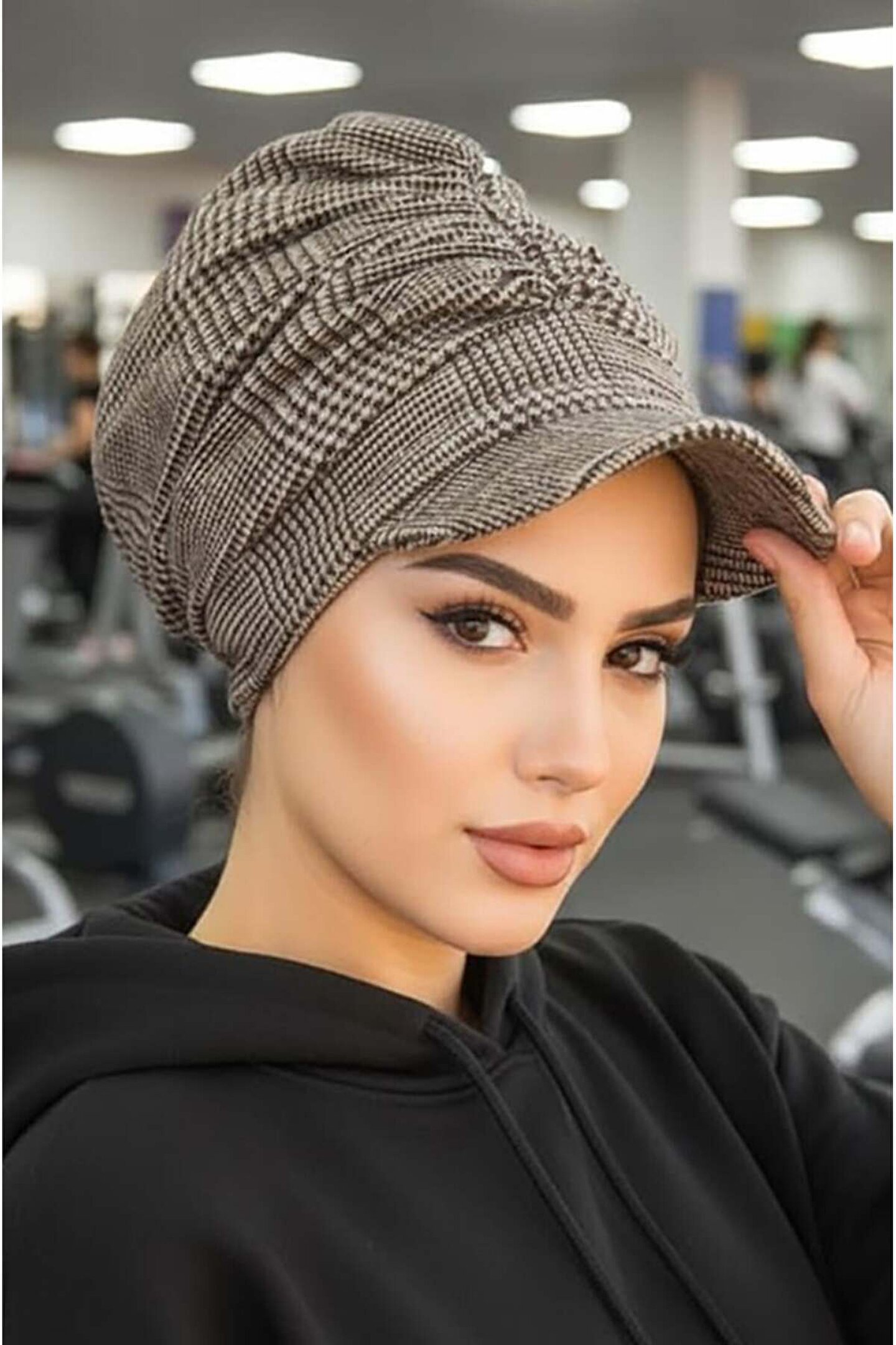 Aişe tesettür Bej Siyah Ekose Tesettür Şapka