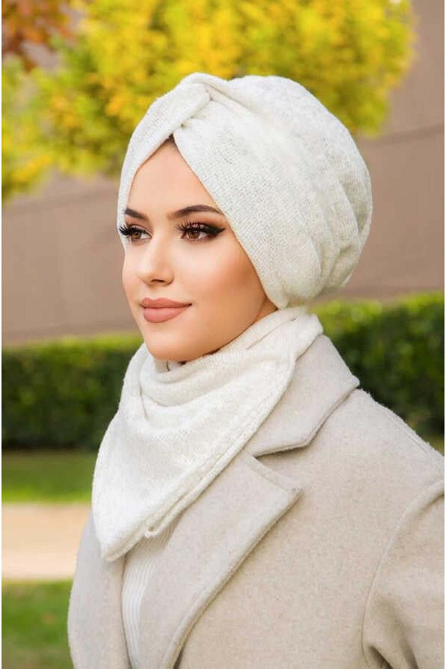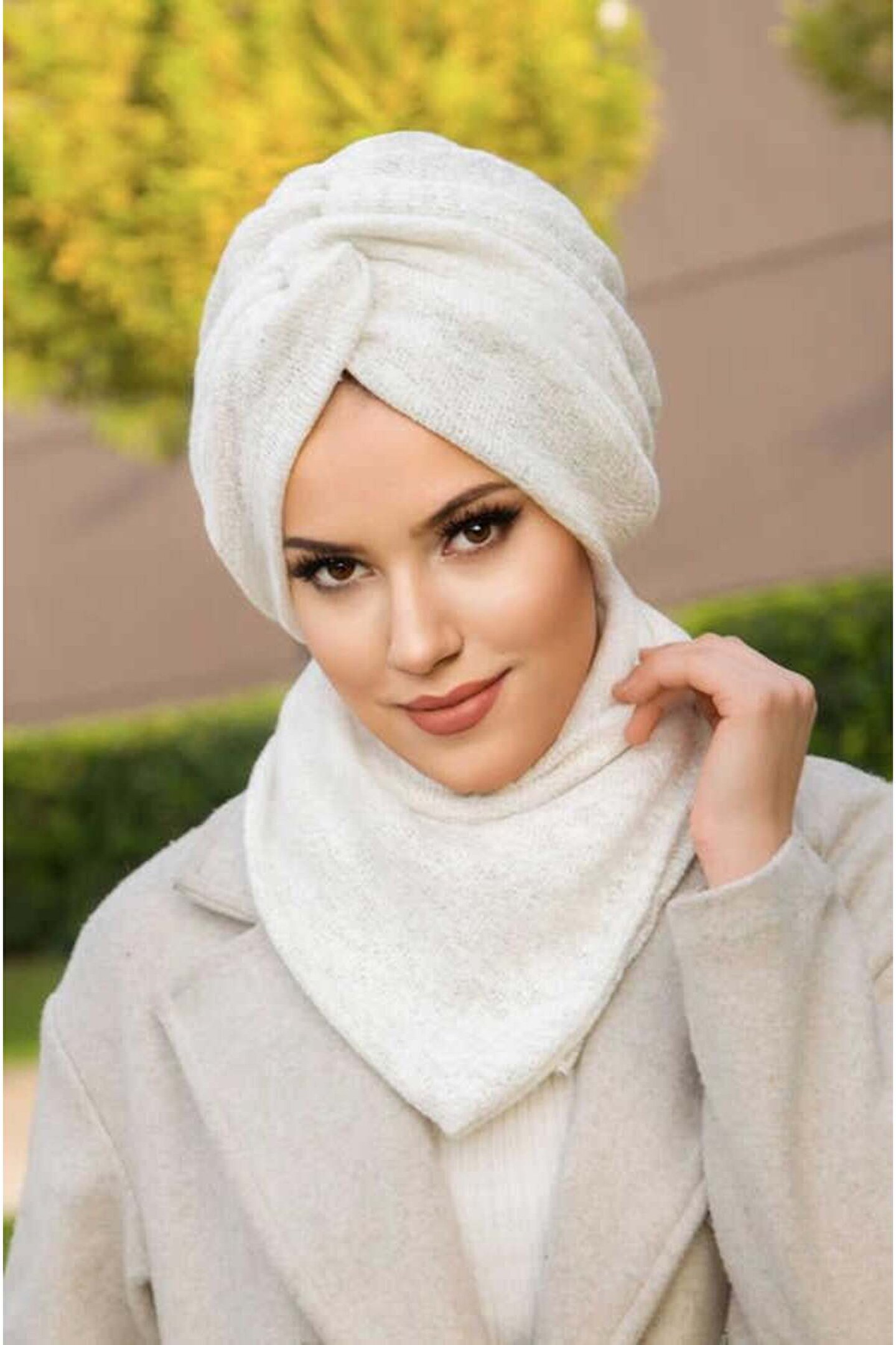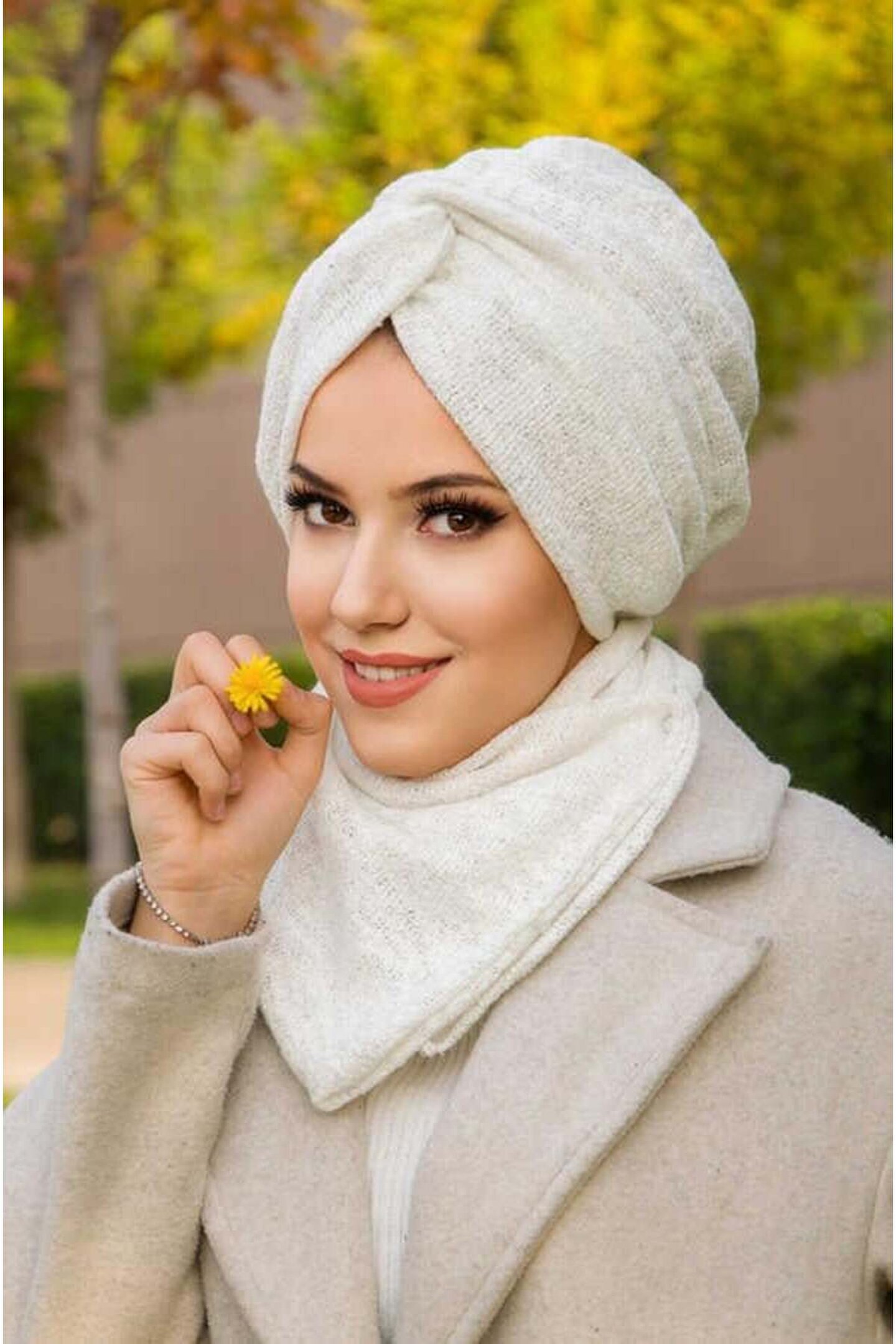 Aişe tesettür Beyaz Triko Kışlık Burgu Bone Ve Etol Takım
