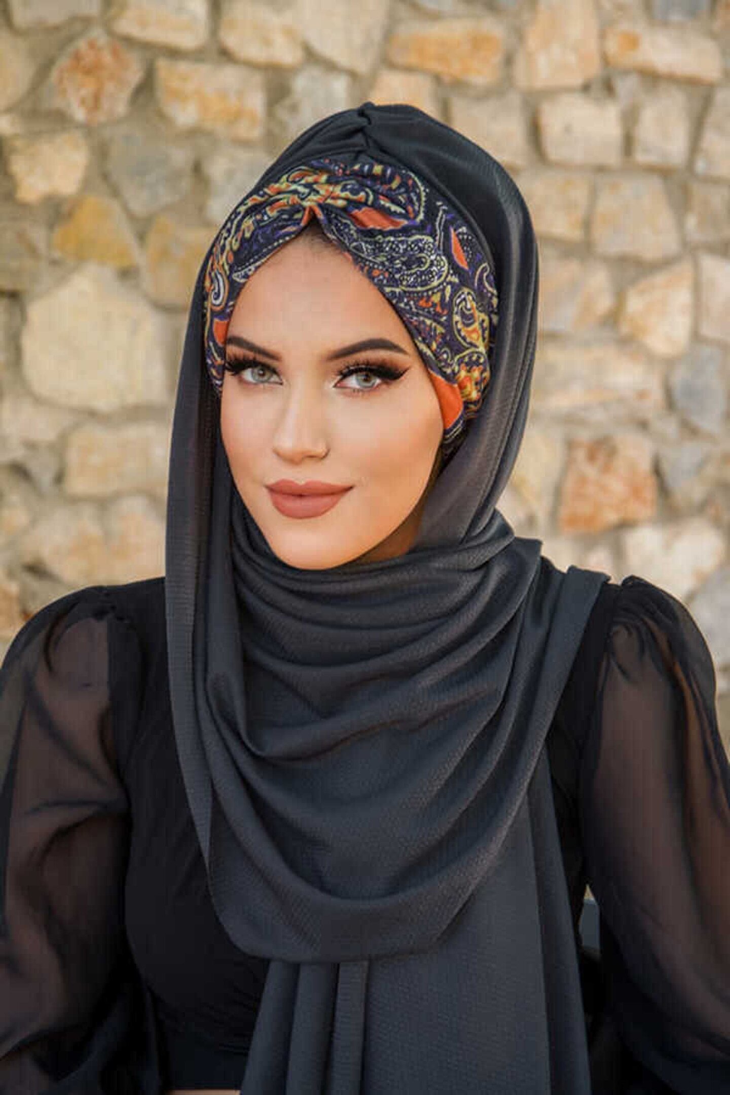 Gri Ekose Büzgülü Tesettür Şapka ve Etol Takım