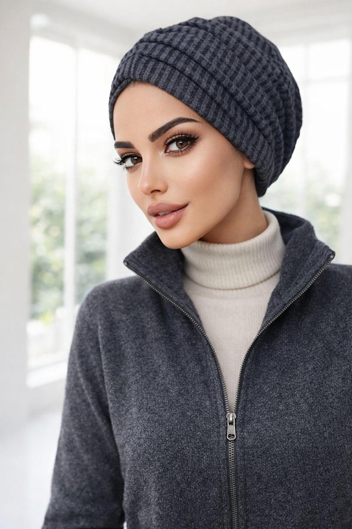 Aişe tesettür Füme Siyah Çizgili Büzgülü Salaş Bone
