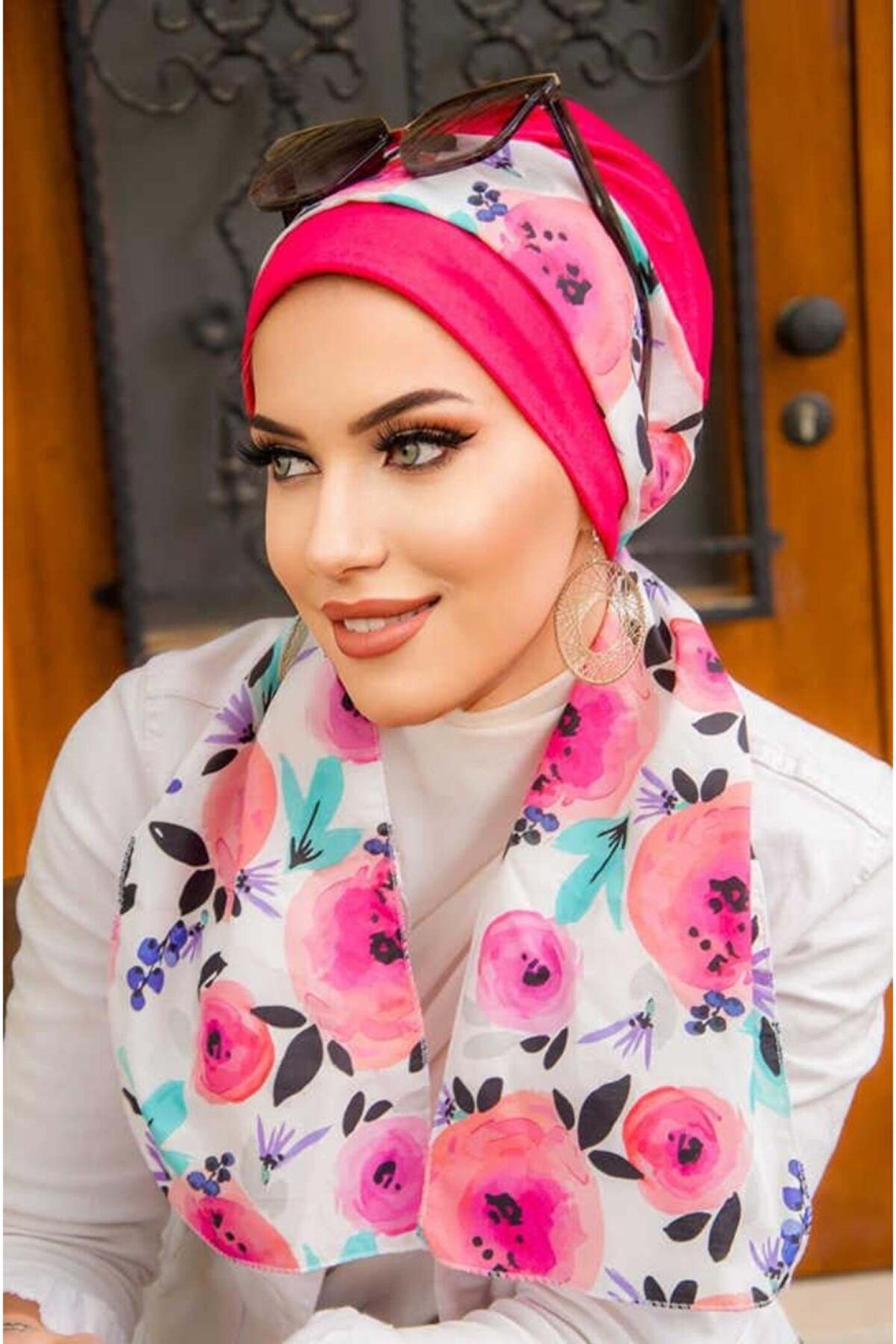 Aişe tesettür Fuşya Çiçek Desen Fularlı Bone