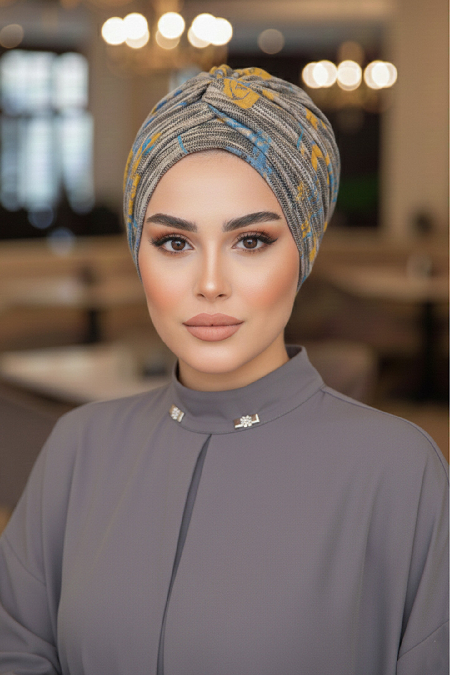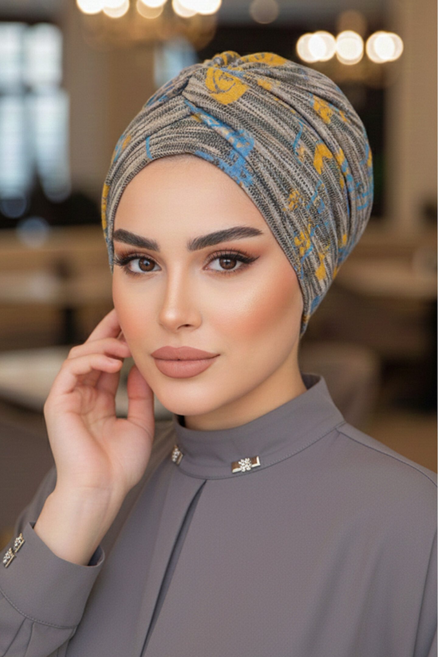 Aişe tesettür Gri Hardal Desen Burgu Detaylı Bone