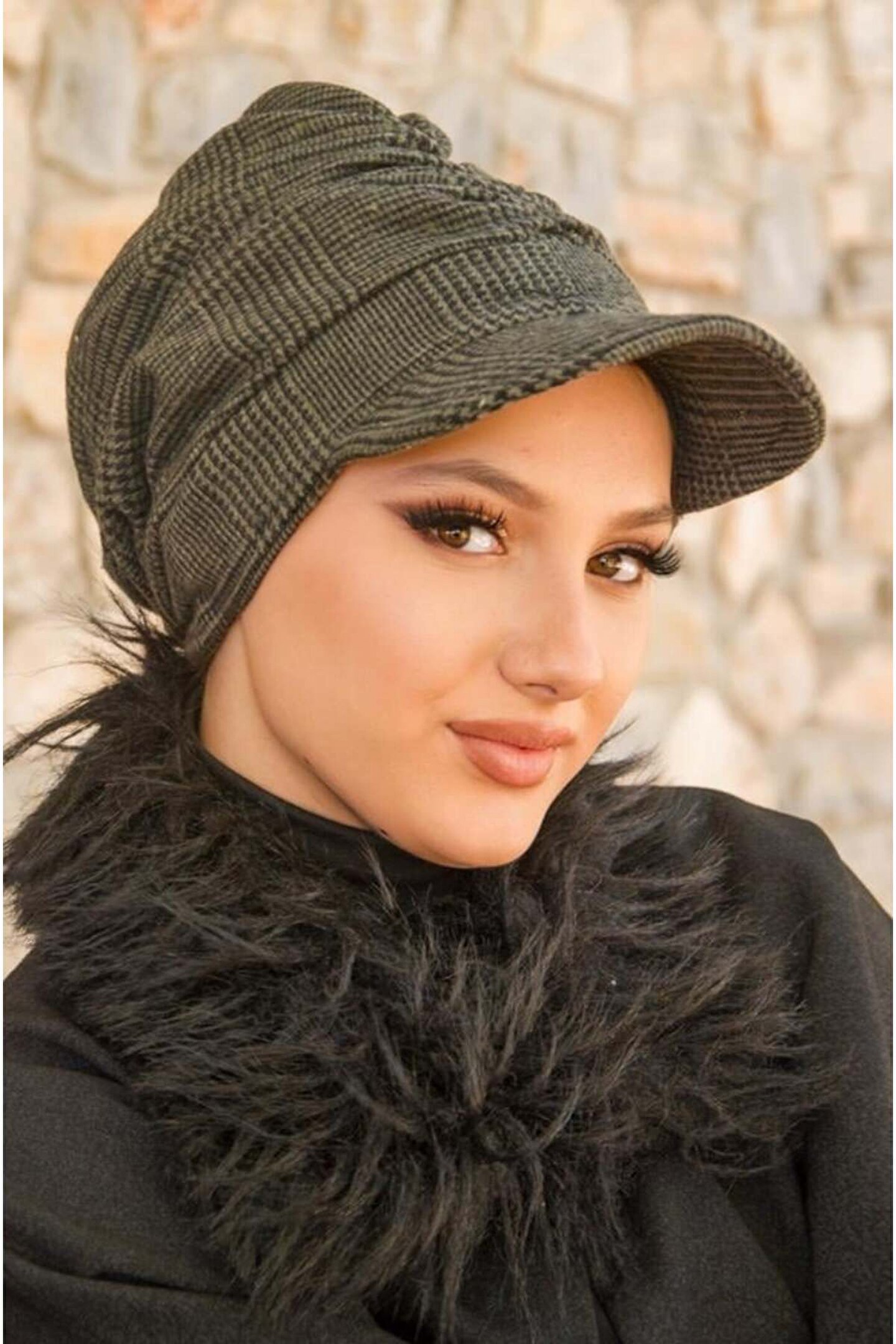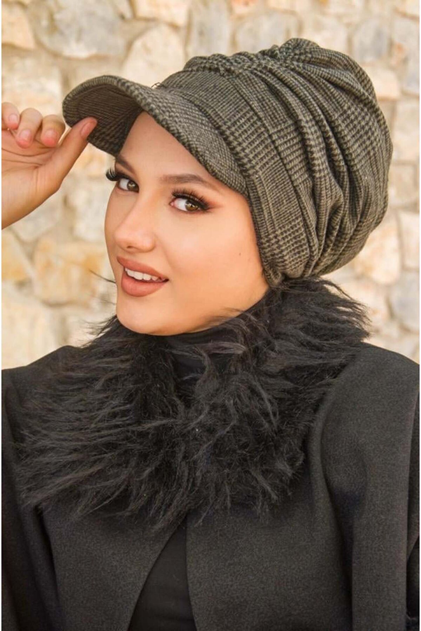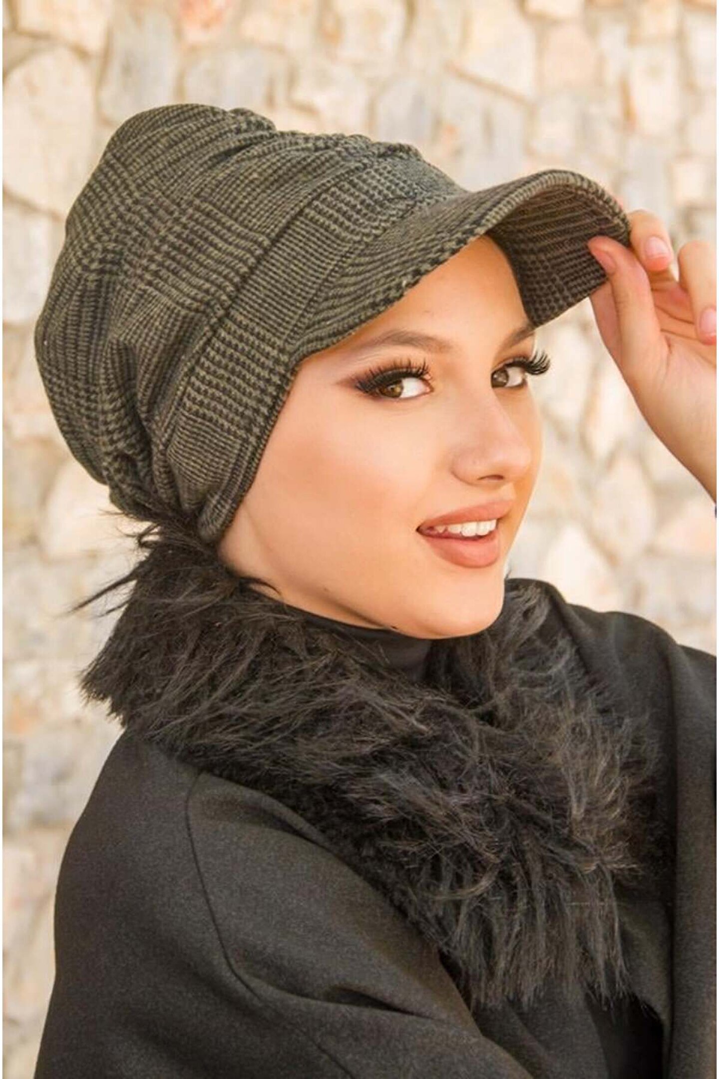 Aişe tesettür Haki Siyah Ekose Desen Tesettür Şapka