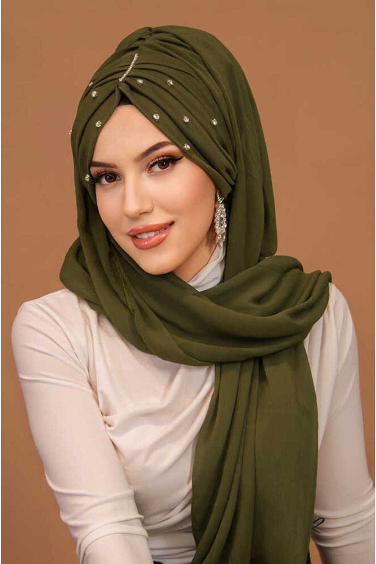 Haki Taşlı Büzgü Model Hazır Abiye Şal