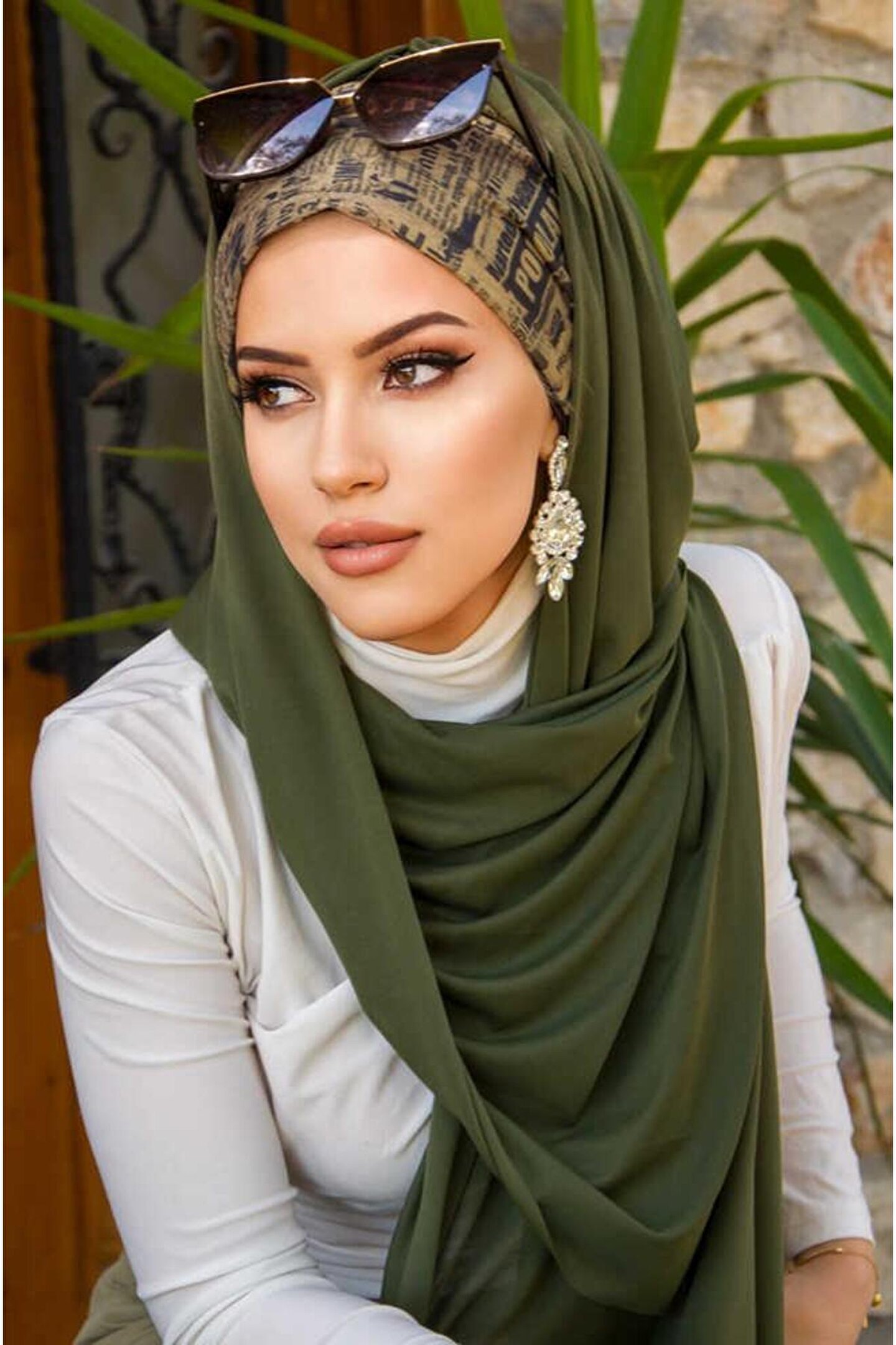 Aişe tesettür Haki Yazı Desenli Bone Hazır Şal