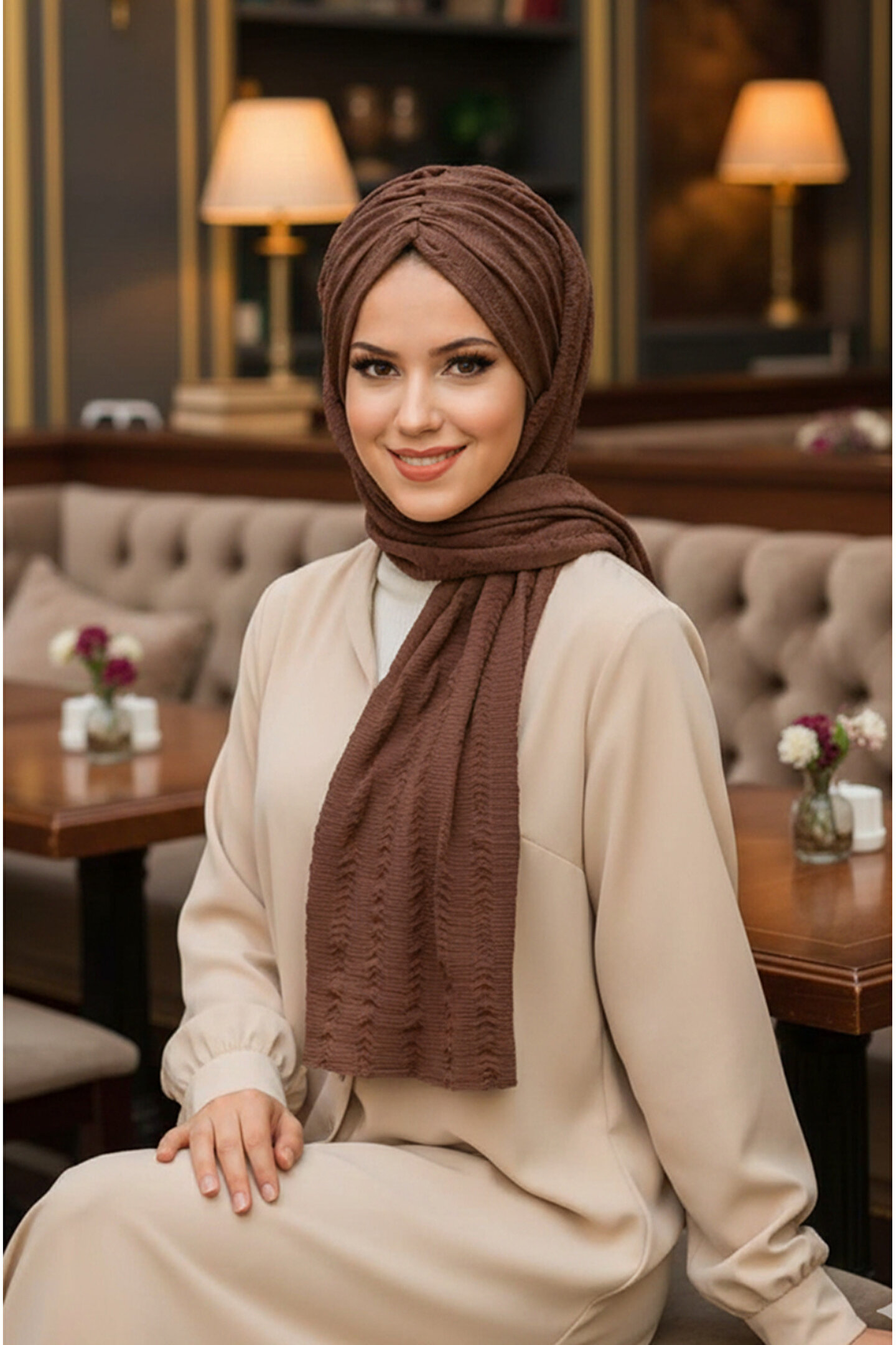 Kahve Kelebek Model Büzgülü Hazır Şal Tak Çık Modeliyle Çok Şık