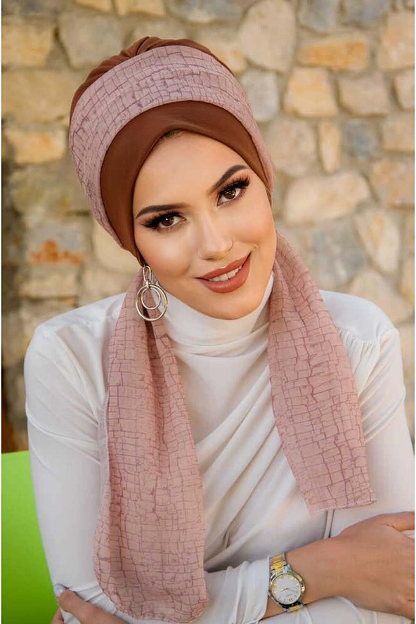 Aişe tesettür Karamel Bej Desen Fularlı Bone