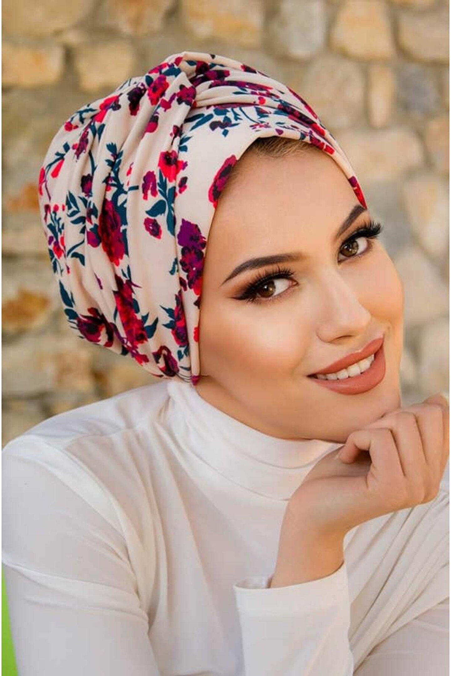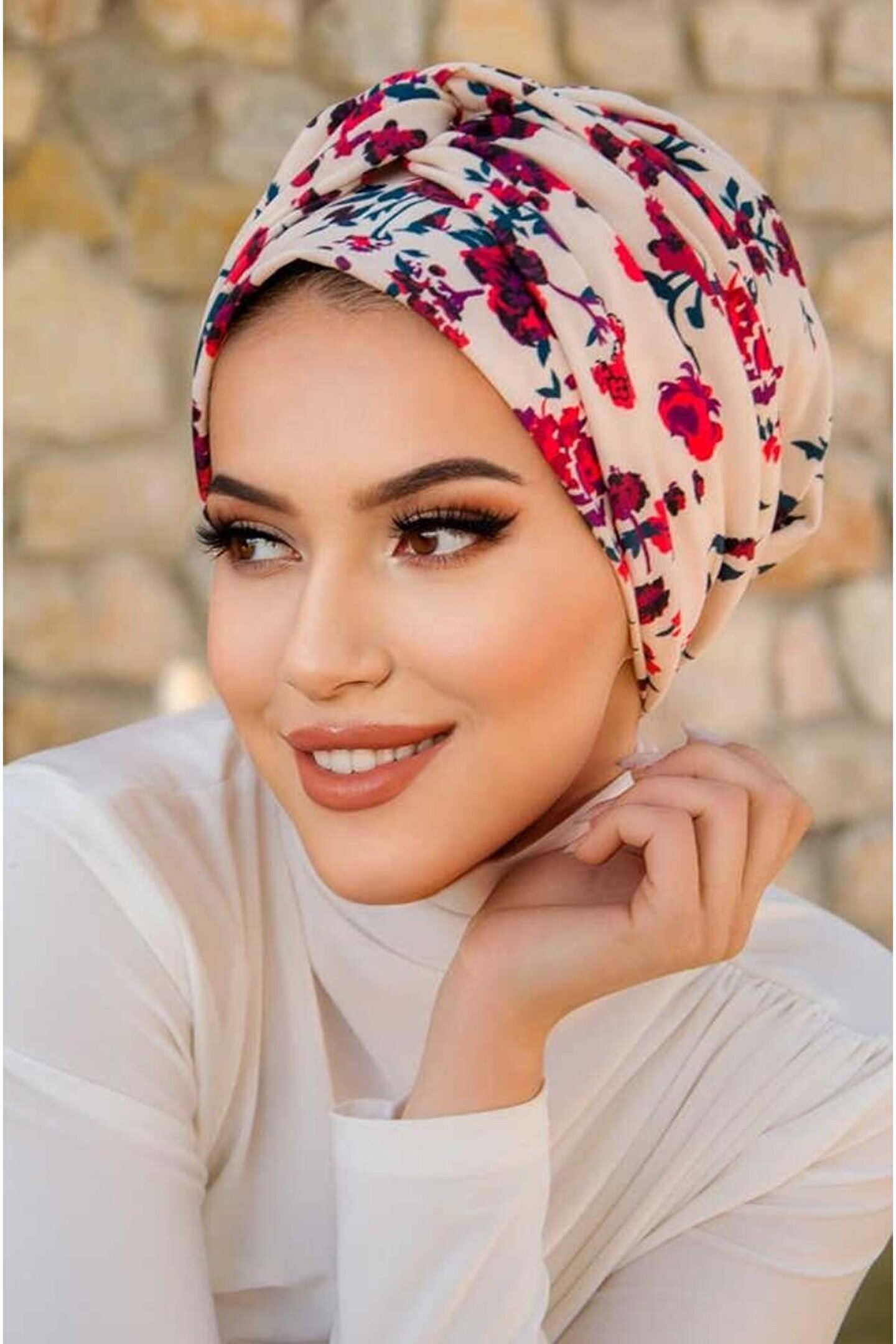 Aişe tesettür Kemik Kırmızı Çiçek Desen Burgu Detaylı Bone