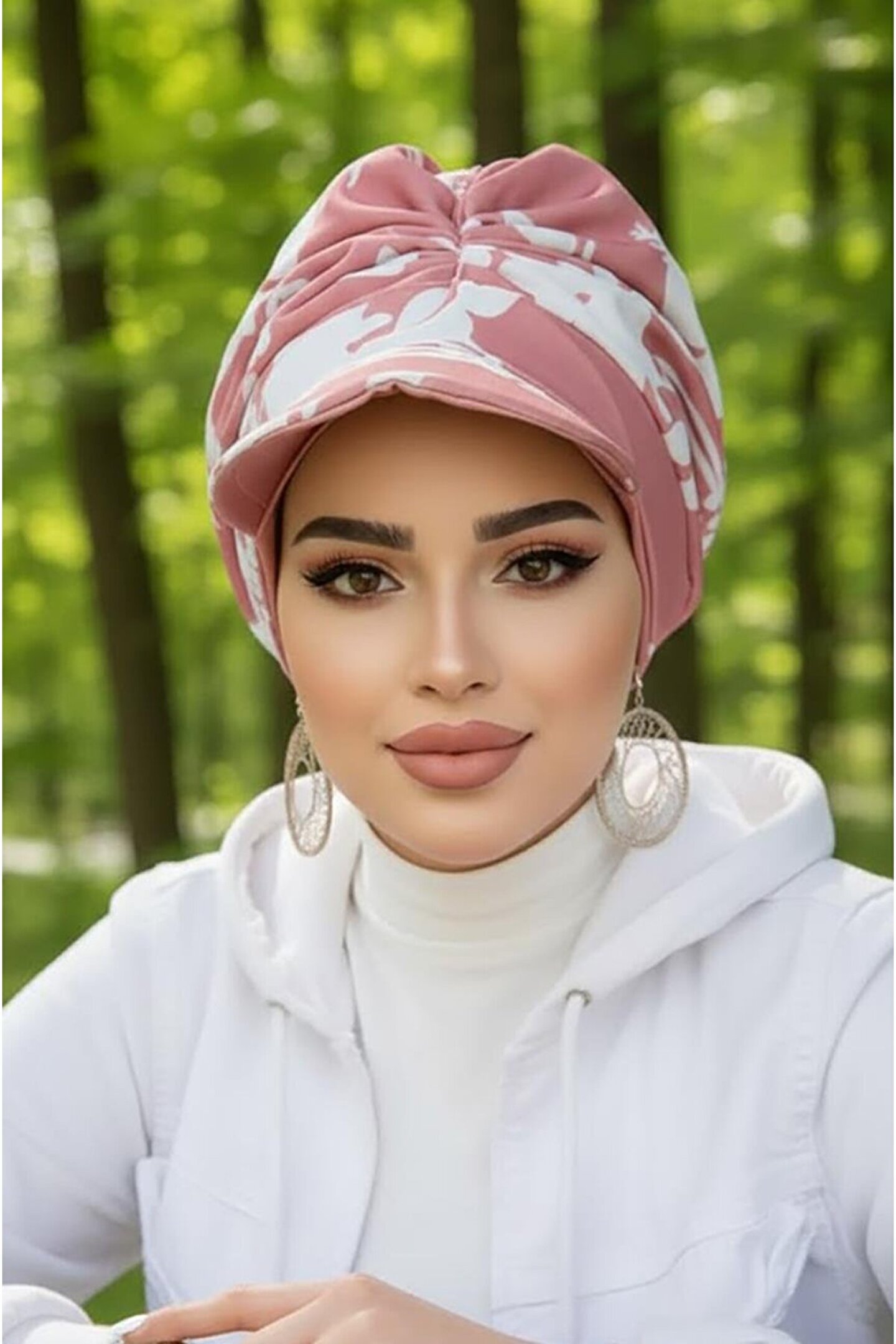 Aişe tesettür Koyu Pudra Beyaz Desen Bantlı Şapka Bone