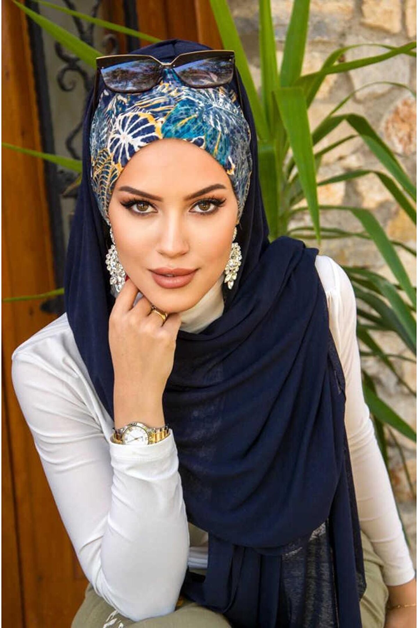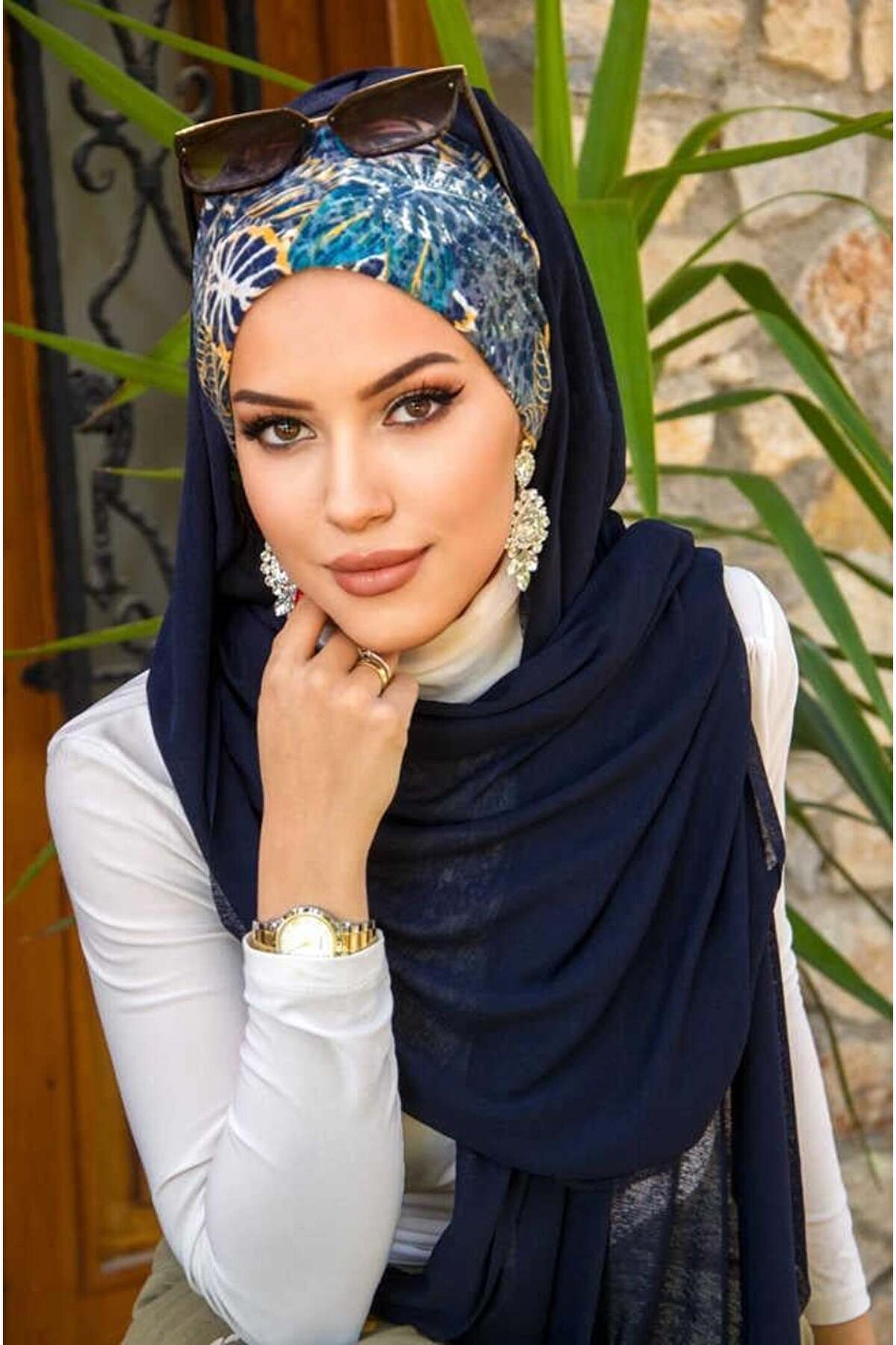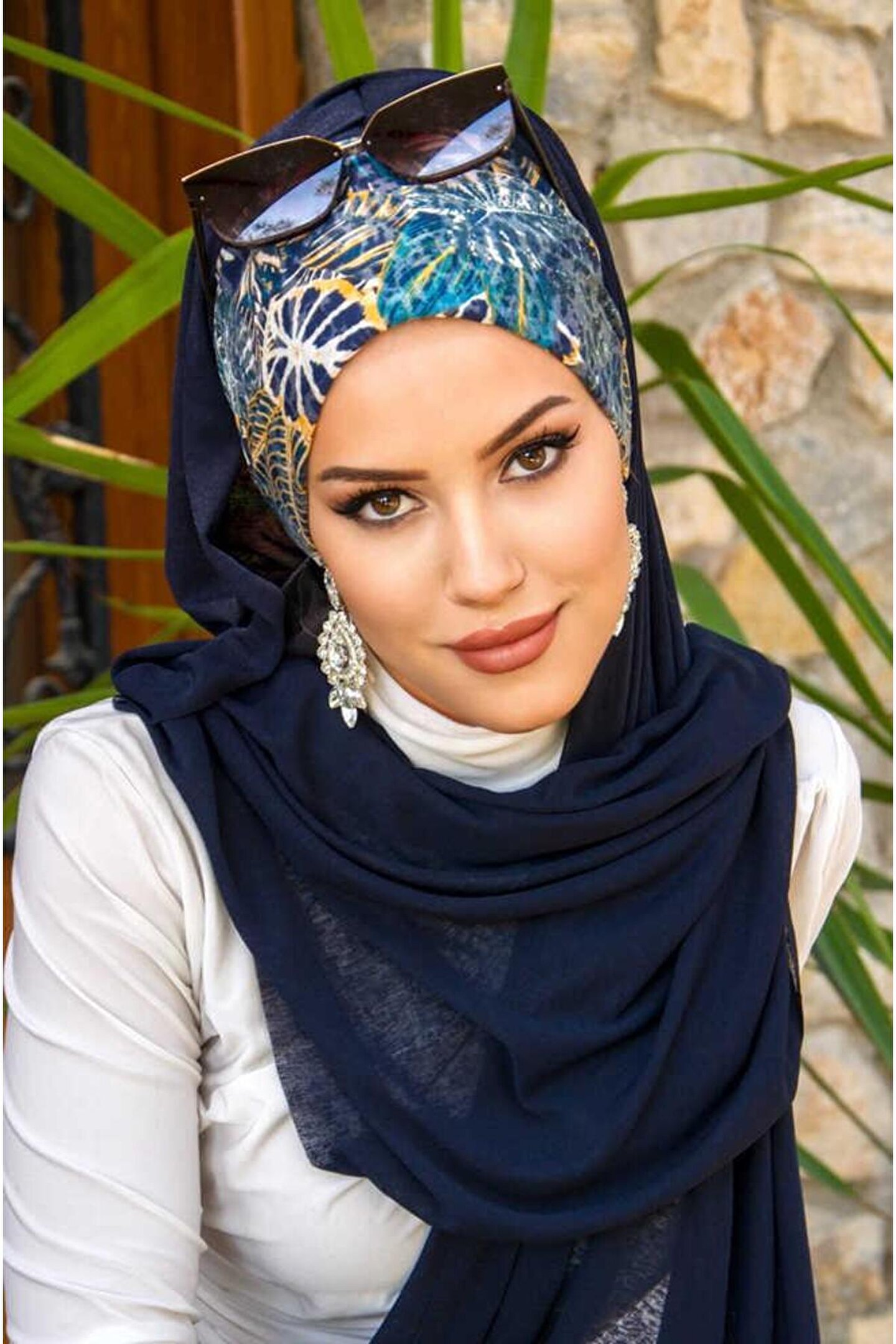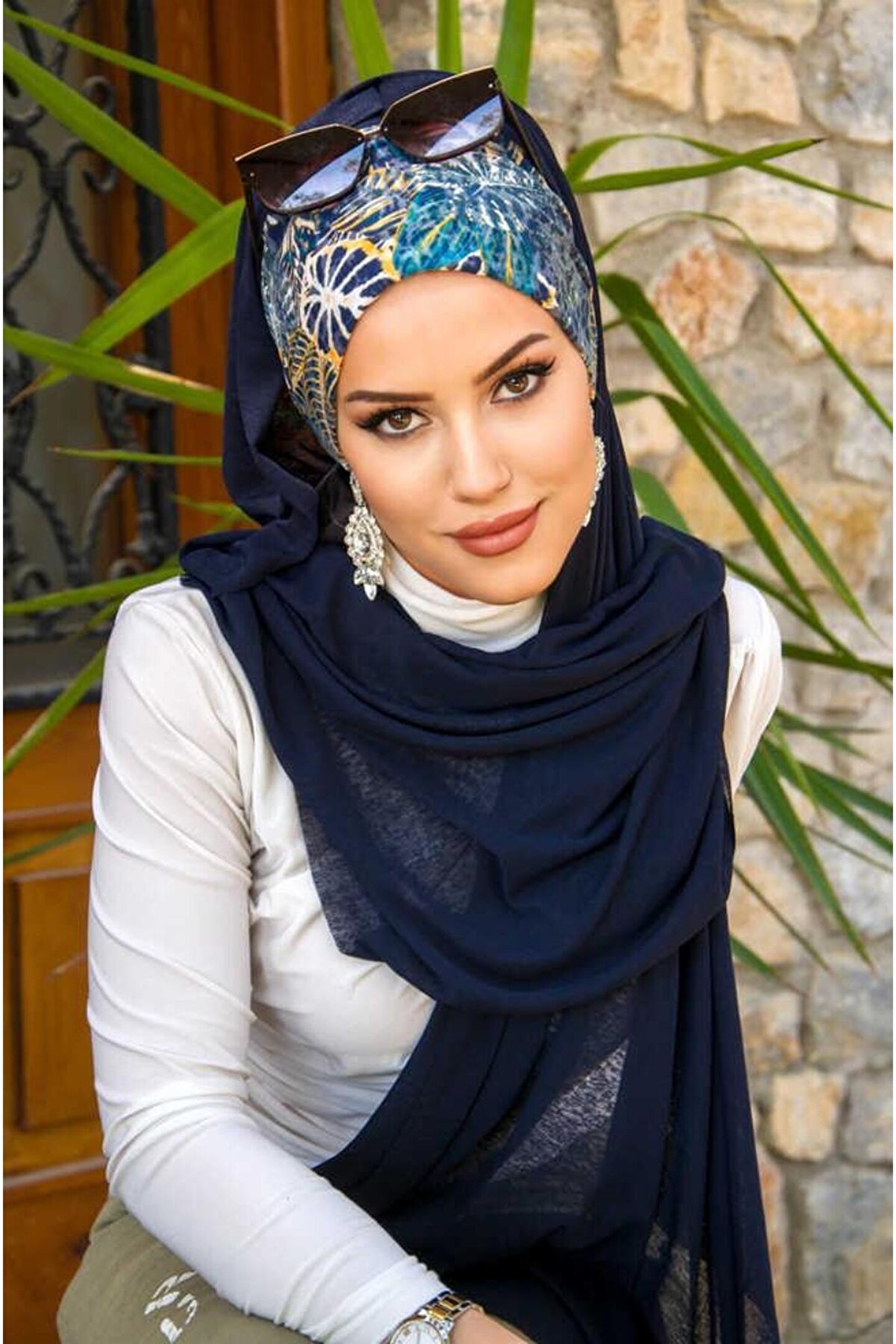 Aişe tesettür Lacivert Çiçek Desenli Bone Hazır Şal