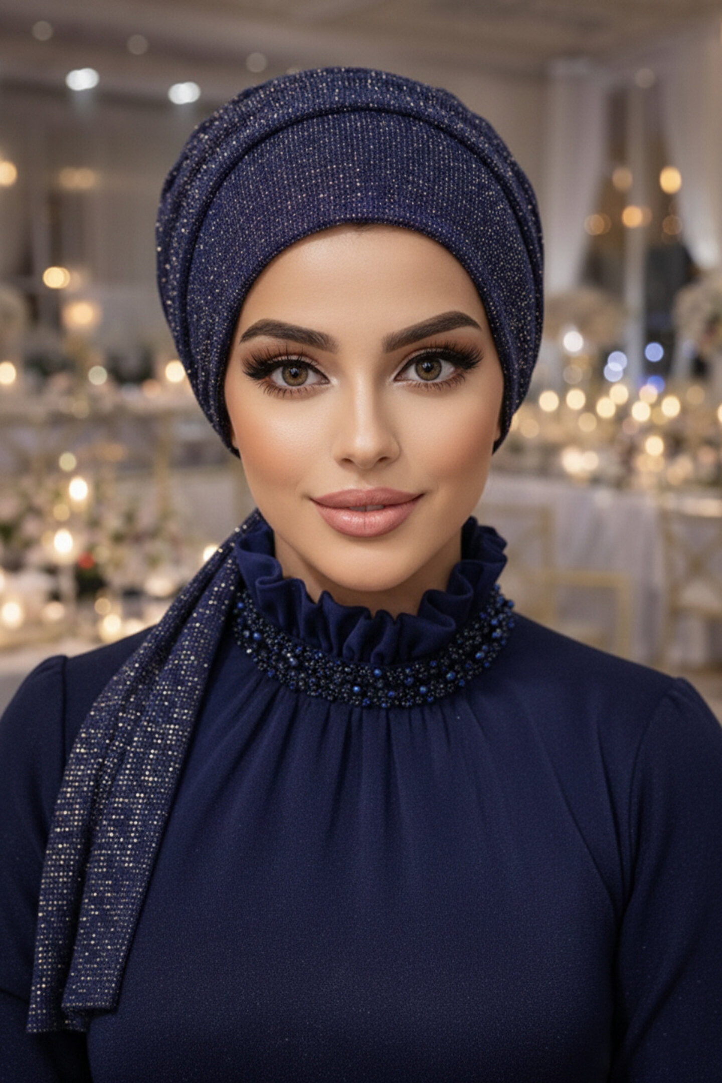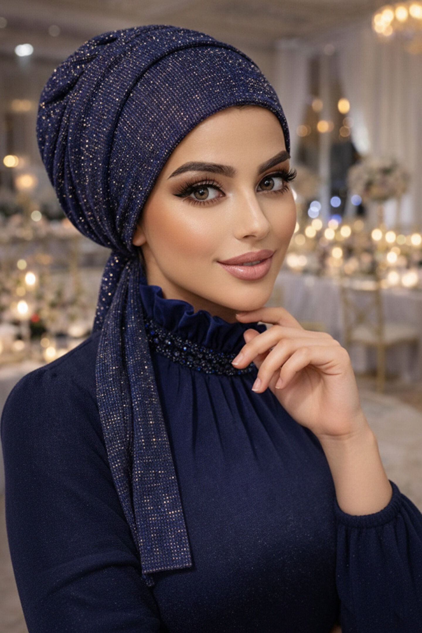 Lacivertin asaleti ve goldun ışıltısı, en pratik formda birleşti! Kendinden simli örme kumaşıyla hem günlük hayatta hem de en şık abiye davetlerinizde göz kamaştırmanızı sağlayacak Lacivert Gold Işıltılı Atkılı Tesettür Bone, hayatınızı kolaylaştırmak için tasarlandı.