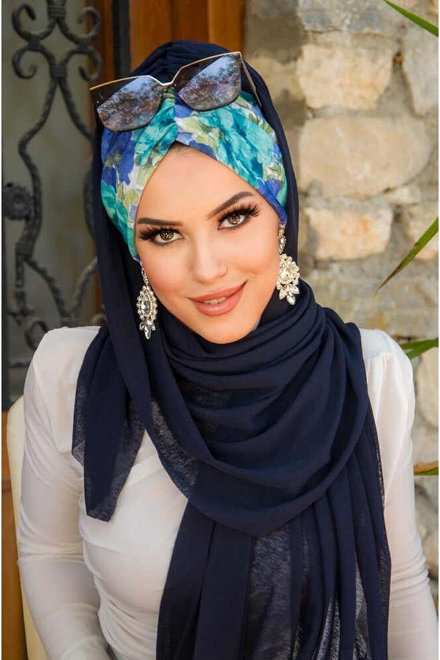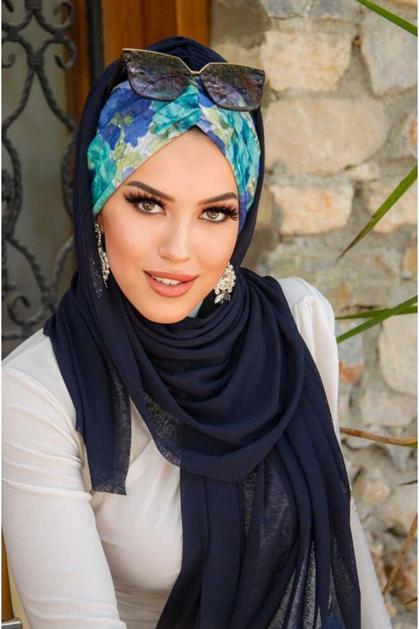 Aişe tesettür Lacivert Turkuaz Çiçek Desen Hazır Şal