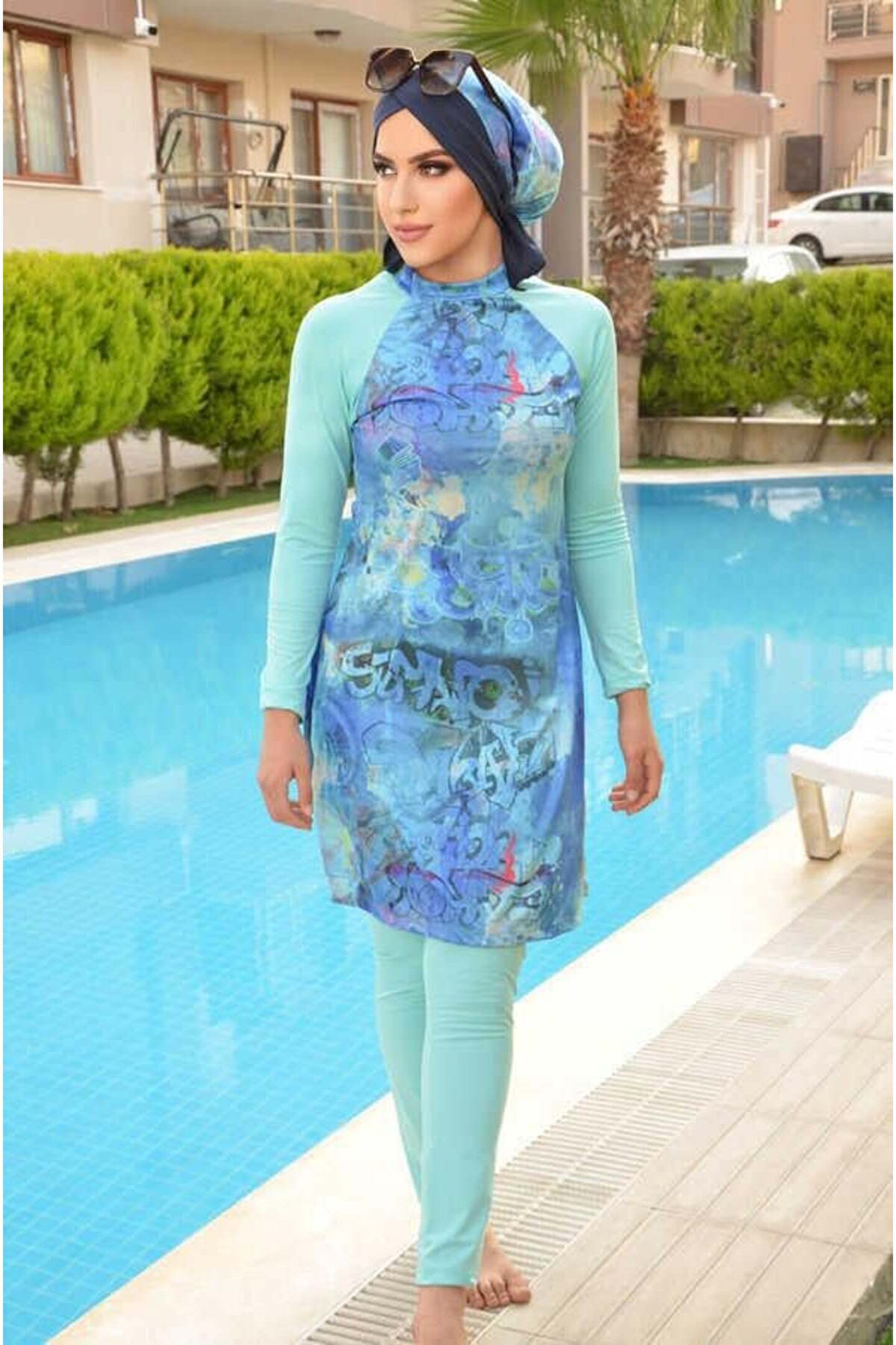 Aişe tesettür Mavi Su Yeşili Desen Tesettür Mayo Takım