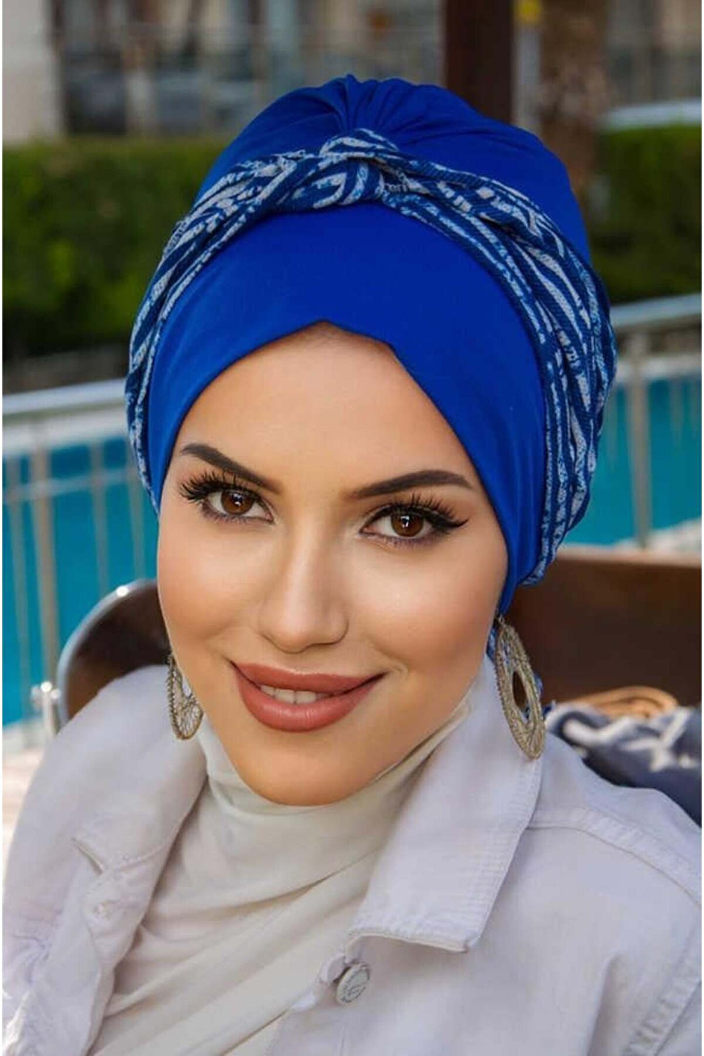 Aişe tesettür Saks Mavi Çizgili Burgu Bantlı Hazır Bone