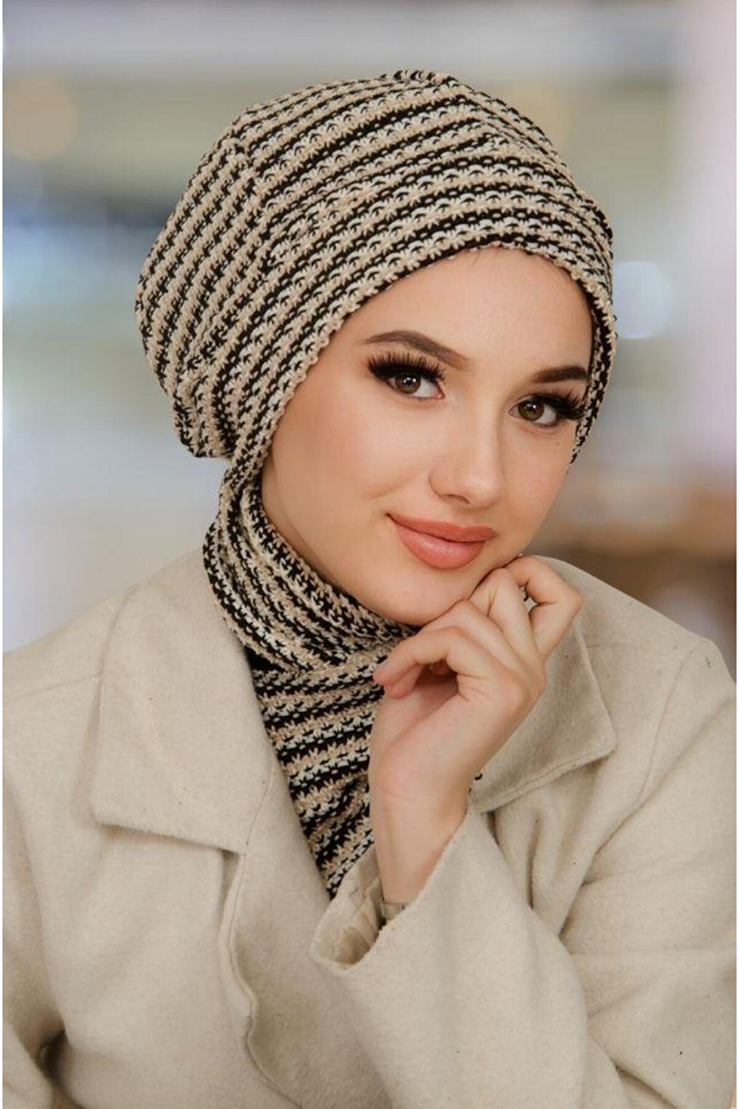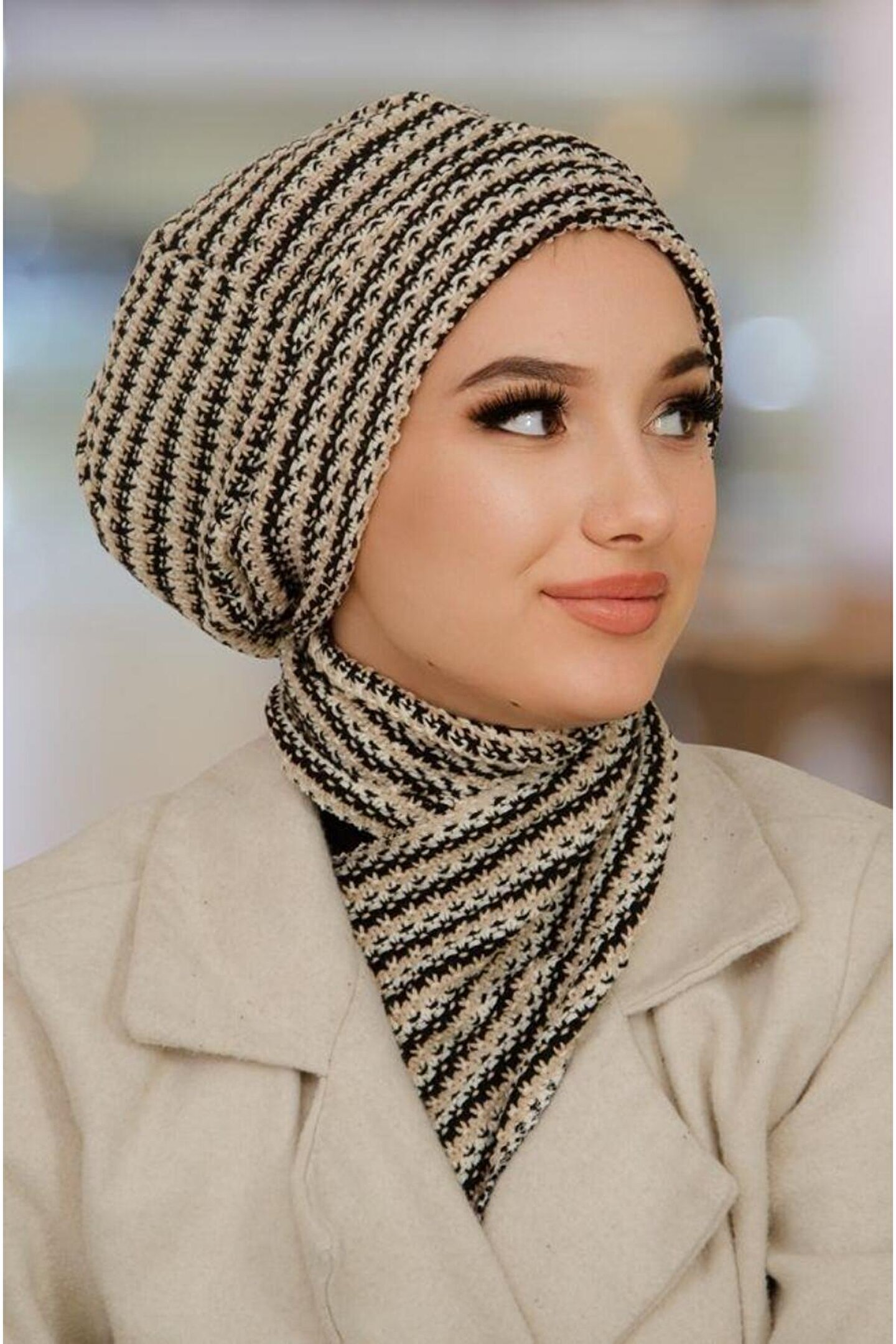 Aişe tesettür Siyah Bej Çizgili Tesettür Bere Ve Etol Takım