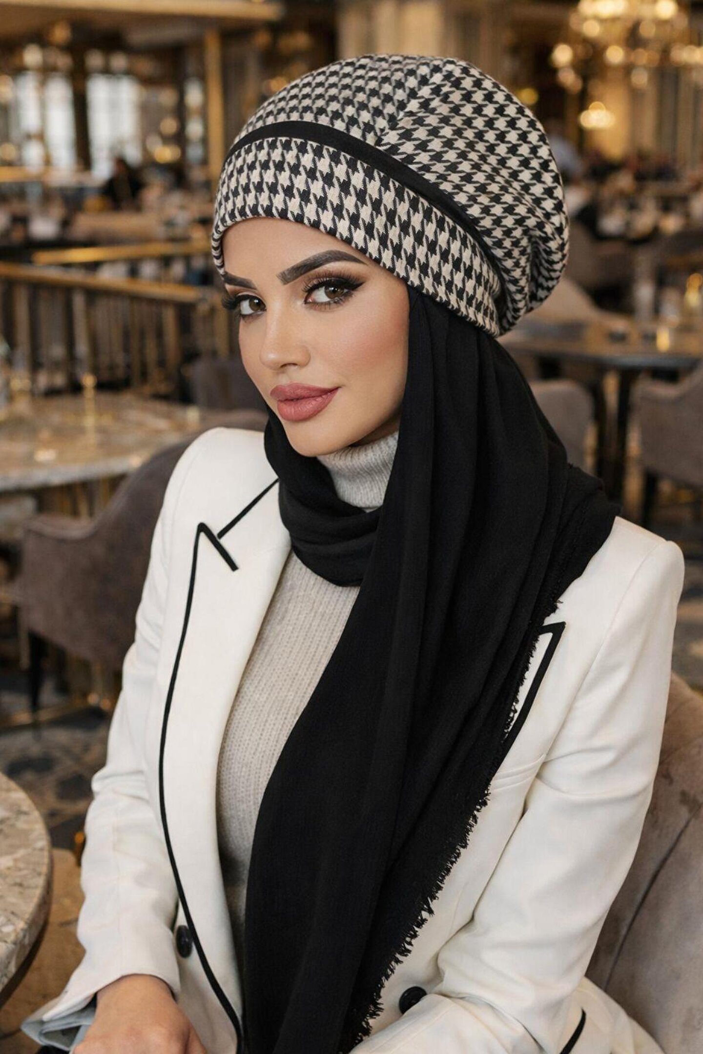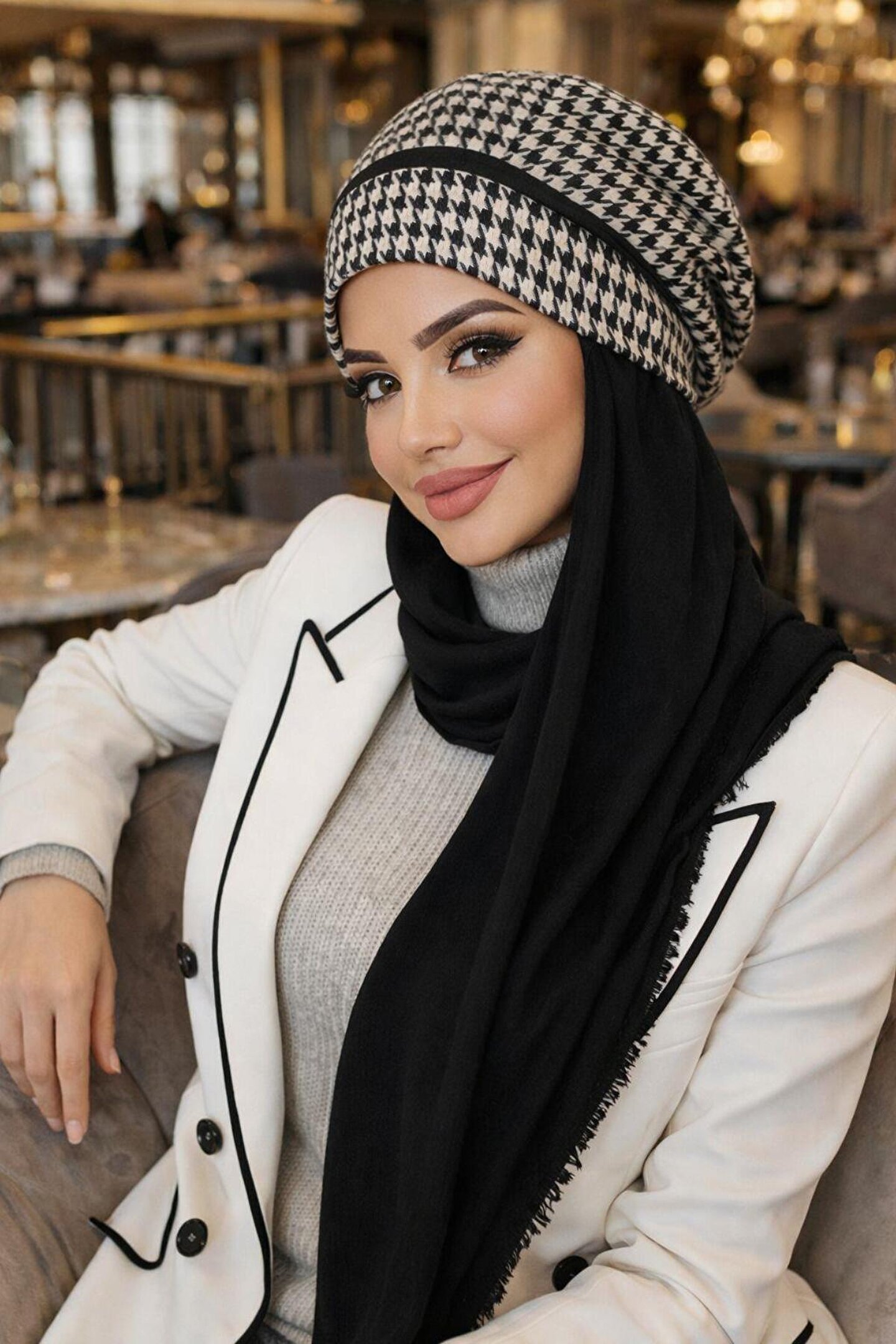 Aişe tesettür Siyah Beyaz Kazayağı Tesettür Bere Şal