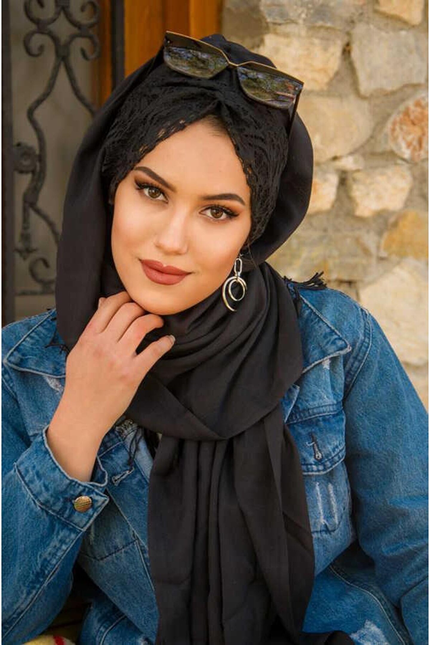 Aişe tesettür Siyah Dantelli Büzgülü Şal