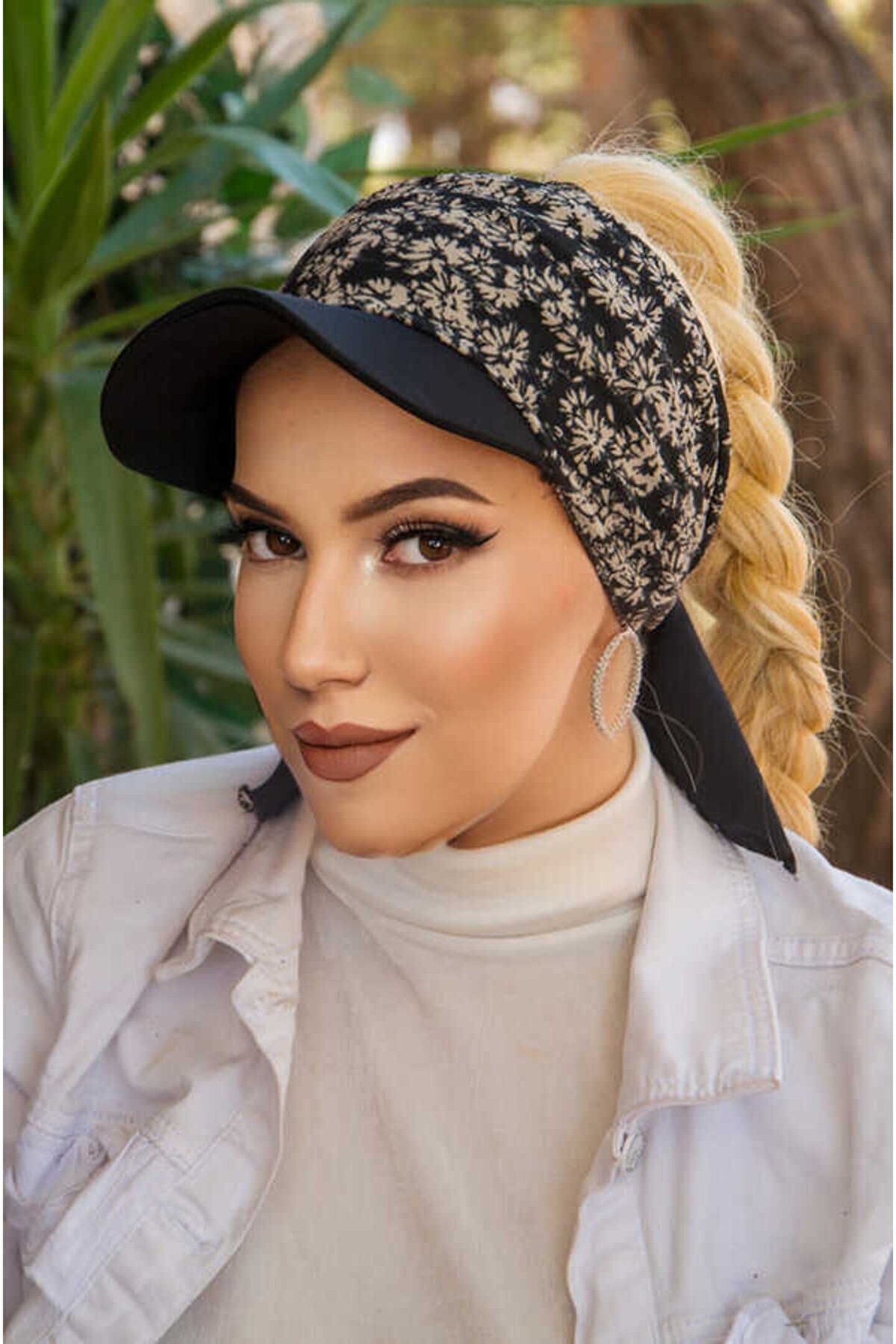 Siyah Ekru Çiçek Desen Bağcıklı Bone Bant