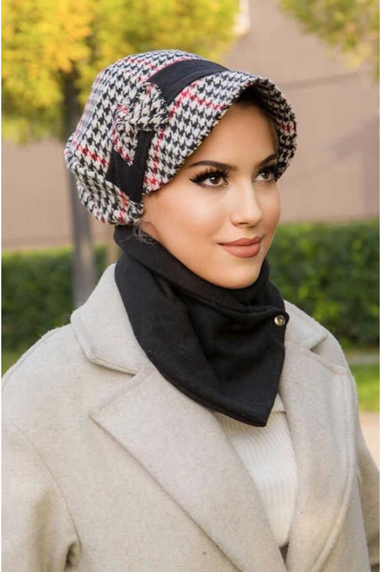 Aişe tesettür Siyah Kırmızı Kazayağı FiyonkluTesettür Şapka Ve Etol Takım