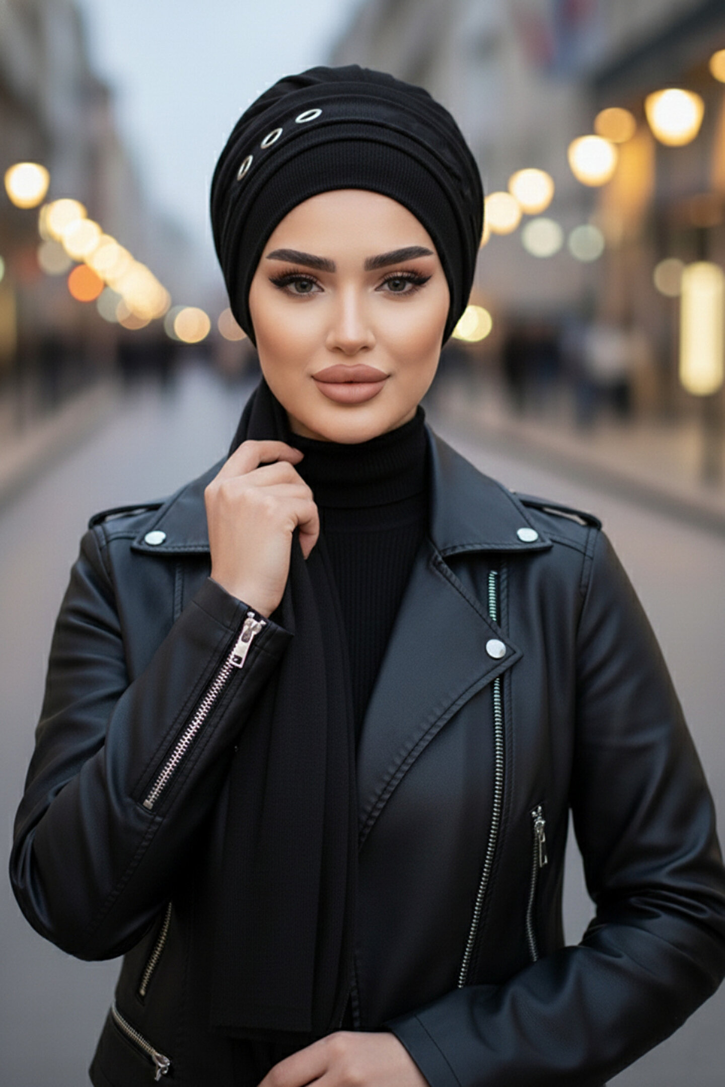 Aişe tesettür Siyah Metal Detaylı Atkılı Bone