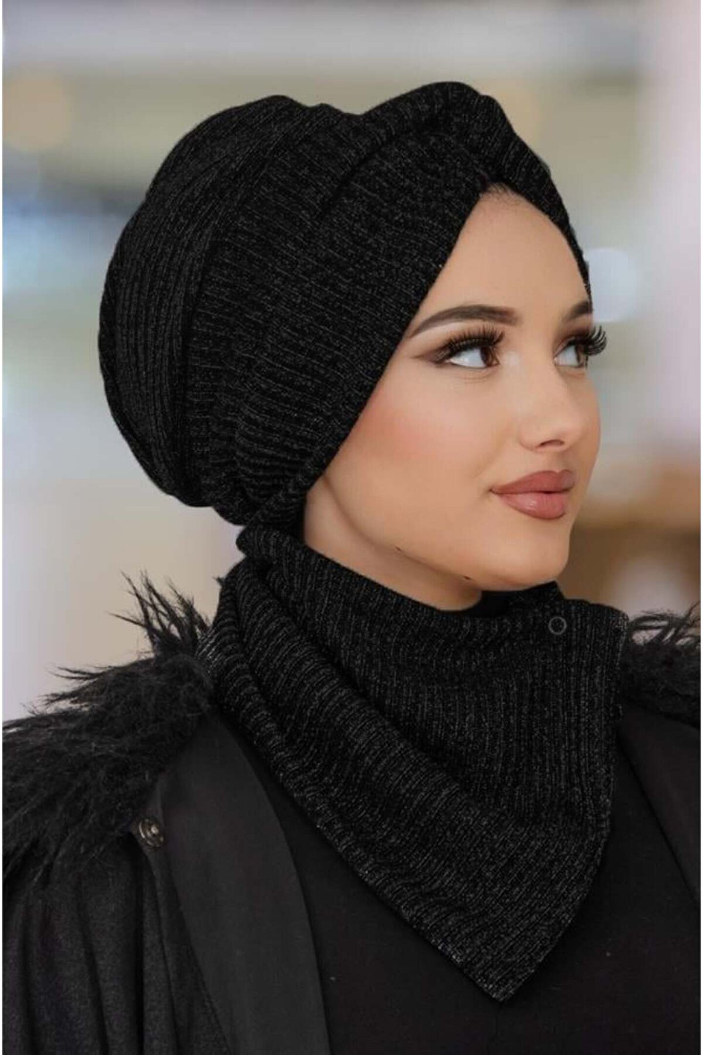 Aişe tesettür Siyah Triko Kışlık Burgu Bone Ve Etol Takım