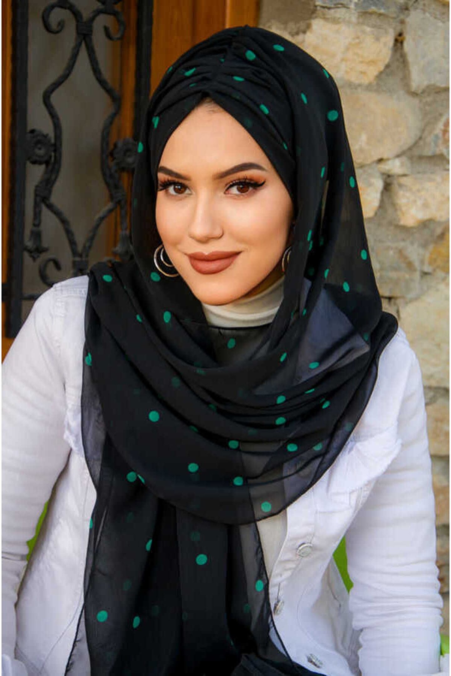 Siyah Yeşil Puan Desenli Hazır Şifon Şal