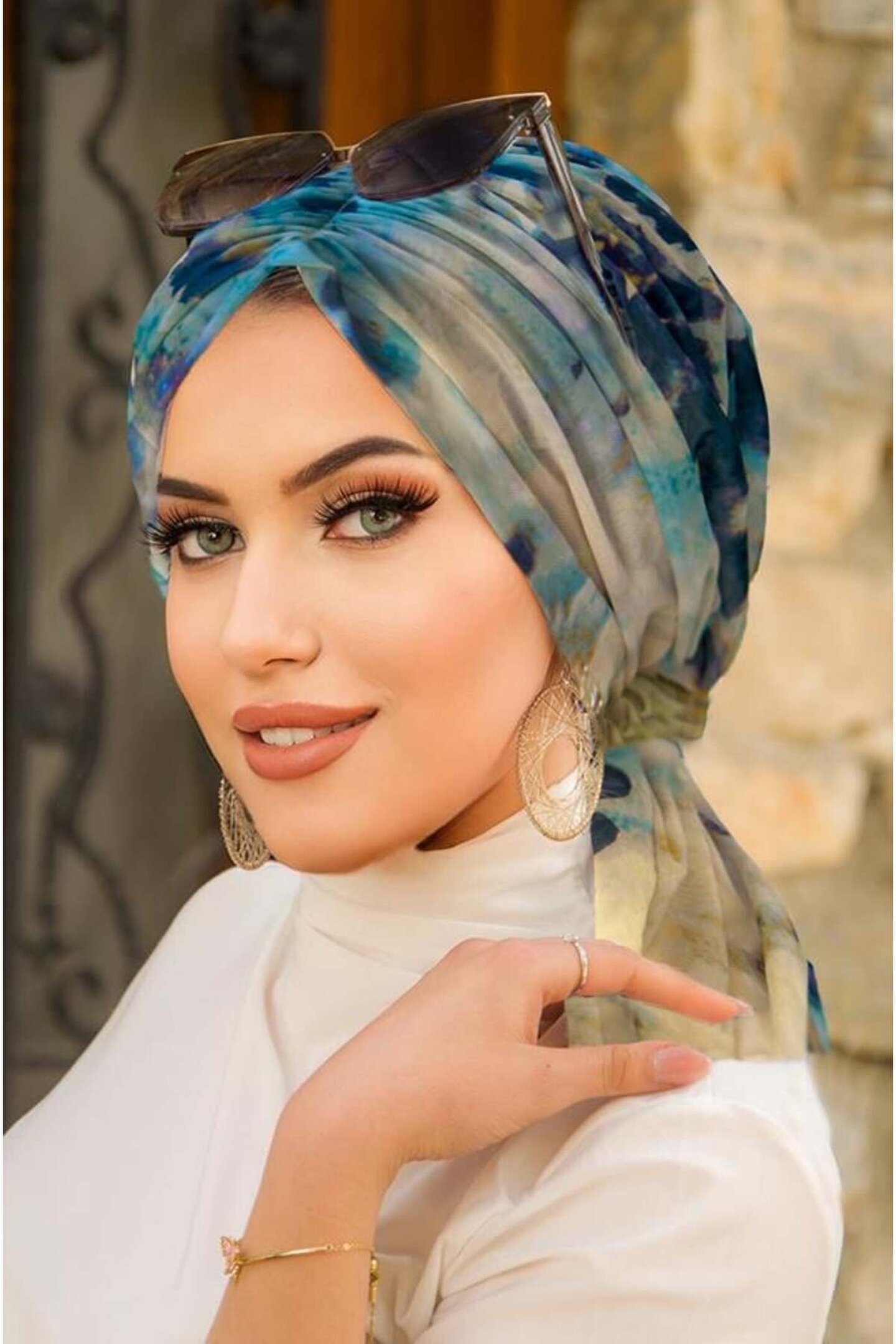Aişe tesettür Turkuaz Batik Desen Tül Tokalı Bone