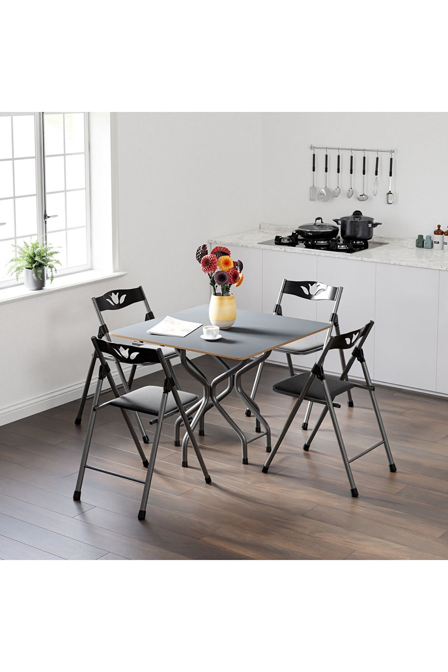 Birinci Kalite %100 Türk Malı; Highglos MDF Malzeme; 1 Adet 90x90 Masa 4 Adet Sandalye Masa Yan Kanatları Katlanır Özelliktedir.; Dar Alanlarda Masanın Bir Kanadı Katlayarakda Kullanabilirsiniz.; Isterseniz 2 kanadınıda katlayabilirsiniz.; Ayrıca tüm sandalyelerde katlanabilir özelliğe sahip olup kullandıktan sonra katlayarak masanın ortasındaki boşluğa yerleştirebilirsiniz.; Sandalyeler, Mutfak Balkon Salon Gibi iç Mekanlarda Kullanılmak İçin Tasarlanmış Olup Şık Görünümü Sayesinde Bulunduğu Ortama Ayrı Bir Güzellik Katacaktır.; Sandalyelerin Sırt ve Mafsalları Plastik Ozellikte Olup Estetiktir.; Sandalyelerin Oturum yerleri Suni deriden imal edilmiştir.; Yenilenmiş Gövde Demir Aksamı En Az 1 ml. Kalınlıktadır.; Gövde Gri renkli Fırın Boya ile Boyanmıştır.; Ürünün Açık Ölçüleri:; 90x90 cm genişlik; 70 cm yükseklik; Ürünün Kapalı Ölçüleri:; 39 cm Genişlik; 90 cm Uzunluk; 70 cm Yükseklik; Ürün Demonte Olarak Gönderim Yapılacaktır.;